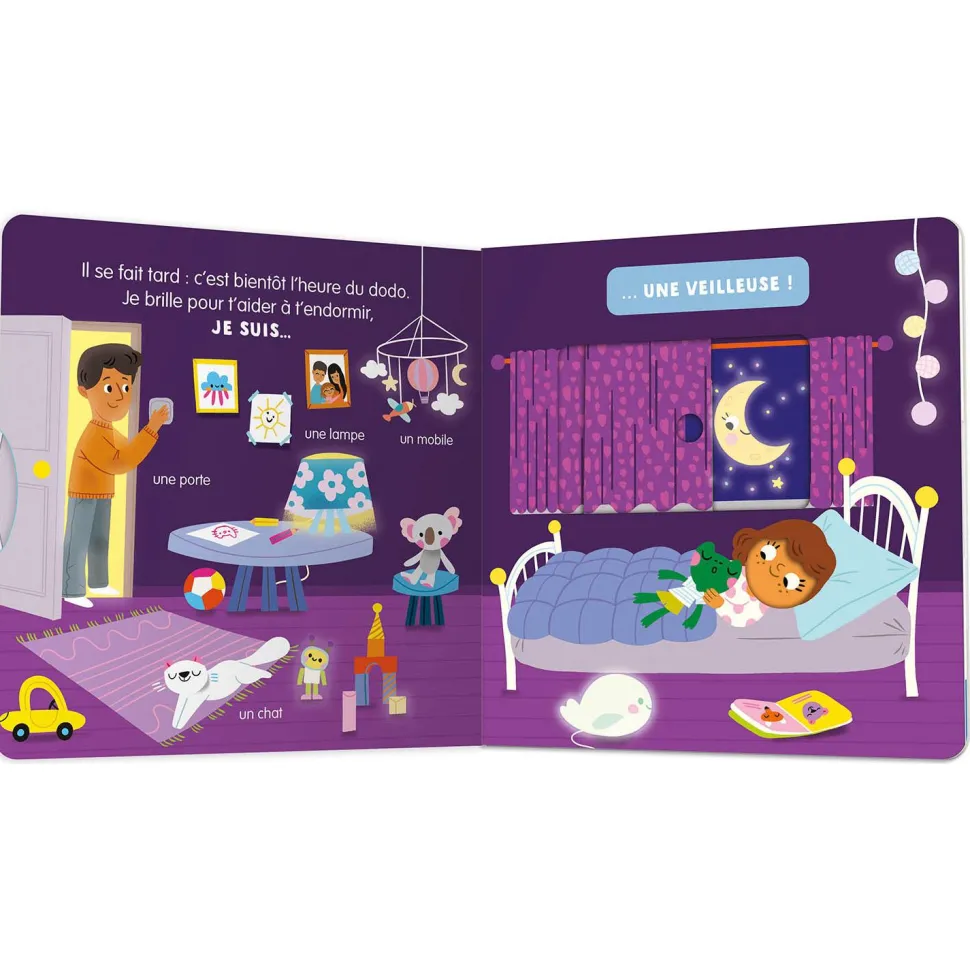 Découvrez le livre jeunesse de la marque Auzou !Le tout-petit se familiarise avec l’univers de la nuit tombée grâce à des mécanismes simples et faciles à activer. Sur la dernière page, amuse-toi à deviner ce qui se cache sous le flap.INÉDIT : Du vernis phosphorescent scintille sur les pages ! Il faut éteindre la lumière pour le faire briller !A partir de 18 mois