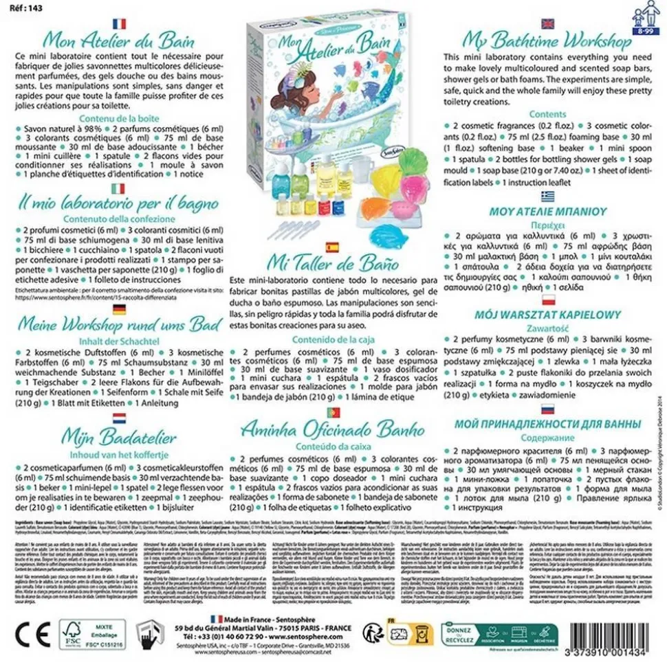 Mon atelier du bain vous offrira un moment de détente !Ce coffret va vous apprendre à faire des savons et des bains moussants aux couleurs de fonds marins et aux senteurs florales et fraîches.Il fera découvrir à l’enfant les principes de la fabrication de produits de beauté. Les produits peuvent être utilisés en toute sécurité grâce aux tests dermatologiques effectués.Contenu :- 250g de savons (permet de réaliser 5 savons)- 3 moules pour savons- 3 colorants- 2 parfums- 1 base pour bain moussant (permet de prendre 8 bains)- 1 base adoucissante- 2 flacons vides- des étiquettes- 1 notice.Dimensions : 28.5 x 28.5 x 4.5 cm.