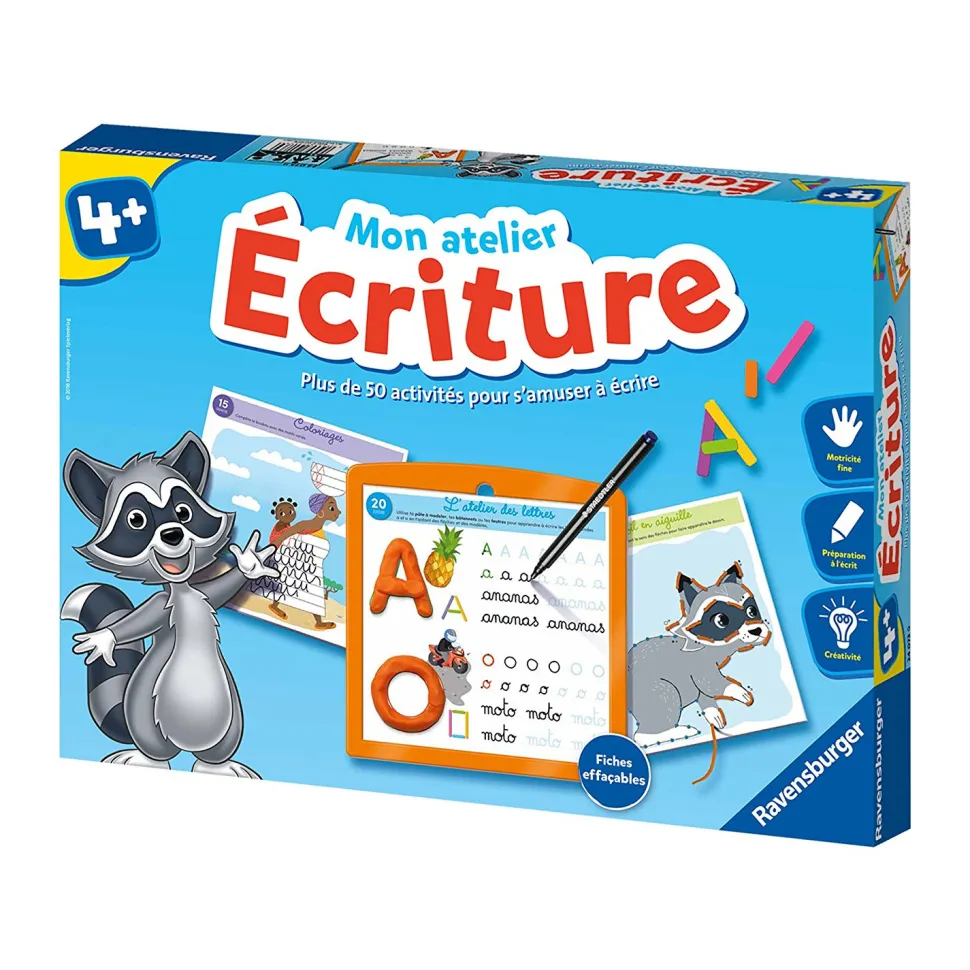 Mon atelier Écriture propose plus de 50 activités pour s’amuser à écrire !Contenu :- 1 tablette support- 4 fiches cartonnées perforées- 24 fiches ardoise recto/verso- 3 lacets- 1 feutre ardoise- 1 chamoisine- 80 bâtonnets de construction- 1 rouleau de pâte à modeler.Ce coffret offre à l’enfant plus de 50 activités conçues avec des enseignants de maternelle. Grâce à un système astucieux de 28 fiches recto/verso évolutives et effaçables, associées à du matériel varié et ludique, votre enfant acquiert à son rythme la maîtrise des premiers gestes de l’écriture.Mon atelier Écriture regroupe trois grandes catégories :- Les premiers gestes de l’écriture : dessin à tracer, parcours à compléter, lettres à lacer…- Les graphismes : graphismes à tracer, points à relier, motifs à dessiner…- Lettres et nombres : l’atelier des chiffres et des lettres à modeler, à construire et à écrire, dictée muette…Ce jeu va favoriser la motricité fine et la créativité de l’enfant tout en le préparant à l’écrit.