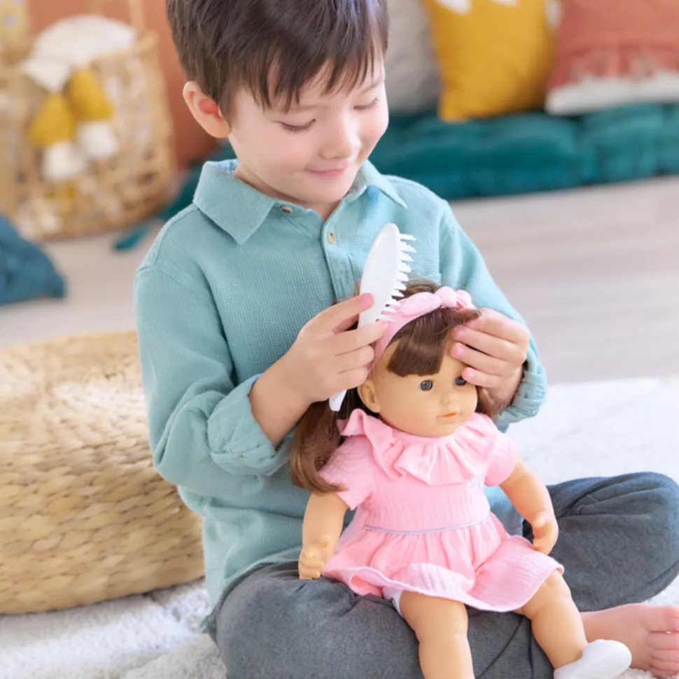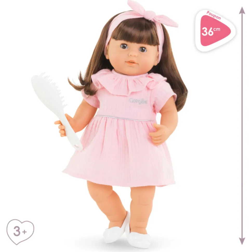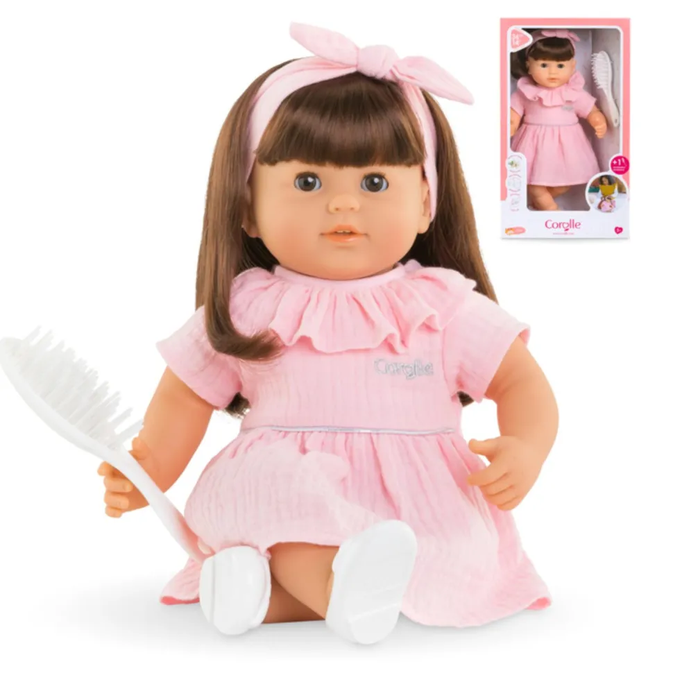 Apprentis coiffeurs… à vos brosses… prêts ? Coiffez ! Avec les long cheveux châtains faciles à coiffer et sa brosse blanche incluse, le grand poupon Julie est le compagnon idéal pour que votre enfant réalise ses toutes premières coiffures ! Du haut de ses 36 cm, Julie a la taille parfaitement adaptée aux petits bras de votre enfant pour câliner, materner et reproduire les gestes qui font devenir grand. Son corps est souple, elle peut donc tenir assise et être manipulée facilement par votre petit. Julie est fatiguée par les séances de coiffure ? Allongé sur le dos, elle ferme les yeux pour faire un gros dodo bien mérité grâce à ses yeux dormeurs. Ce grand poupon, à la peau blanche et les yeux marrons, a tous les attributs d’un poupon Corolle : son visage, ses bras et ses jambes sont en vinyle doux au toucher et ont cette délicate senteur de vanille. Elle est habillée d’une robe rose tendre en gaze de coton. Elle est coiffée d’un bandeau rose assorti à sa tenue, et chaussée d’une paire de ballerines blanches. Une passion pour la coiffure est née chez votre enfant ? Offrez-lui le Coffret Coiffure, qui complétera à merveille son expérience de jeu. Julie dispose d’une collection complète de vêtements et d’accessoires dans la gamme mon grand poupon Corolle pour imiter les gestes du quotidien et s’inventer des scénarios de jeu multiples et variés. Attention : Ce grand poupon de 36 cm, ne peut pas prendre de tétine dans sa bouche.