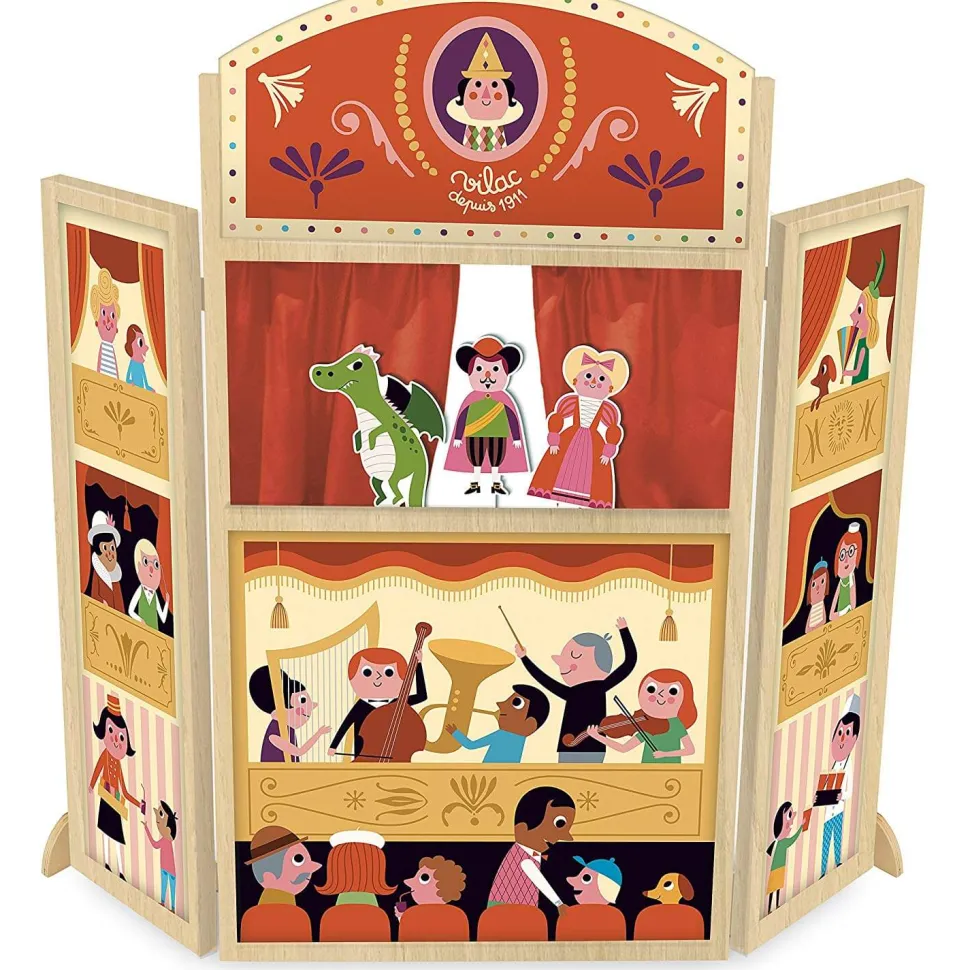 Silence dans la salle, le théâtre de marionnettes va lever le rideau ! Quelle histoire allez-vous imaginer aujourd’hui ?Ce magnifique théâtre en bois avec des rideaux rouges est illustré avec les dessins de l’artiste suédoise Ingela P.Arrhhenius et se compose de trois parties pour cacher les coulisses comme dans un vrai théâtre.Les trois petites marionnettes cartonnées n’attendent plus que vous pour vivre d’incroyables histoires ! Les aventures vont se succéder : Le Prince devra t-il sauver la princesse du dragon ? Ou s’agit-il d’un gentil dragon ? A vous d’écrire l’histoire !Vivement les 3 coups et l’ouverture du rideau …Contenu : – 1 Théâtre en bois. – 3 marionnettes silhouettes : 1 prince, 1 princesse, 1 dragon. Dimensions du théâtre : 115 x 110 x 5 cm.