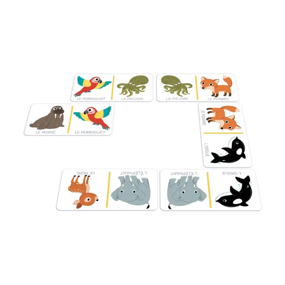 Découvrez ce premier jeu de domino sur le thème des animaux adapté aux enfants à partir de 2 ans !Contenu de la boîte :- 28 dominos grand format (15 x 7,5 cm)Ce jeu de domino aux images colorées se base sur le principe du domino traditionnel adapté aux plus jeunes grâce à un thème qui leur est cher, celui des animaux : lion, chimpanzé, manchot, perroquet … Le but du jeu est de se débarrasser de ses dominos en associant les cartes d’animaux identiques.Le nom de chaque animal est écrit sur les dominos.