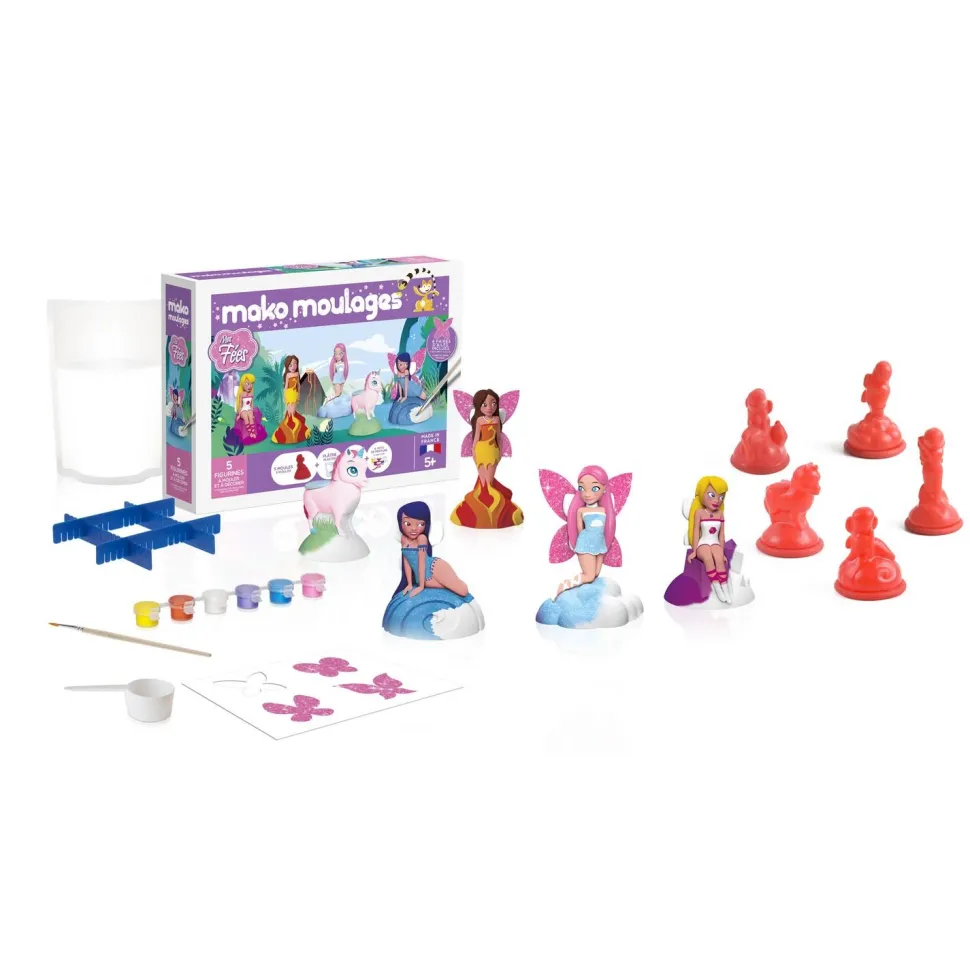 Créez un monde imaginaire !Avec ce coffret de Mako Moulages, découvrez 4 magnifiques petites fées puisant leurs pouvoirs magiques au coeur des 4 éléments de la nature. Jade, La Fée de la Terre; Alba, La Fée de l’Air; Luz, La Fée du Feu et Marina, La Fée de l’Eau, ces 4 jolies fées sont accompagnées de Mipou leur licorne magique.Pour réaliser les moulages Mako en plâtre, c’est très simple :D’abord préparez le plâtre en suivant les instructions de la notice. Ensuite coulez doucement le plâtre dans un des moules. Enfin, démoulez votre figurine et peinez la comme il vous plaît ! Vous pouvez découper et coller les ailes scintillantes sut vos fées, incluses dans ce kit, pour donner vie à vos créations !Contenu : – 1 pinceau- 1 sachet de plâtre refermable- 4 croisillons- 1 cuillère doseuse- 5 moules en latex- 6 mini pots de peinture (pailleté)- 4 paires d’ailes scintillantesPour réaliser encore plus de fées, retrouvez sur notre site des Recharges de plâtre sous la référence Mako-39004.
