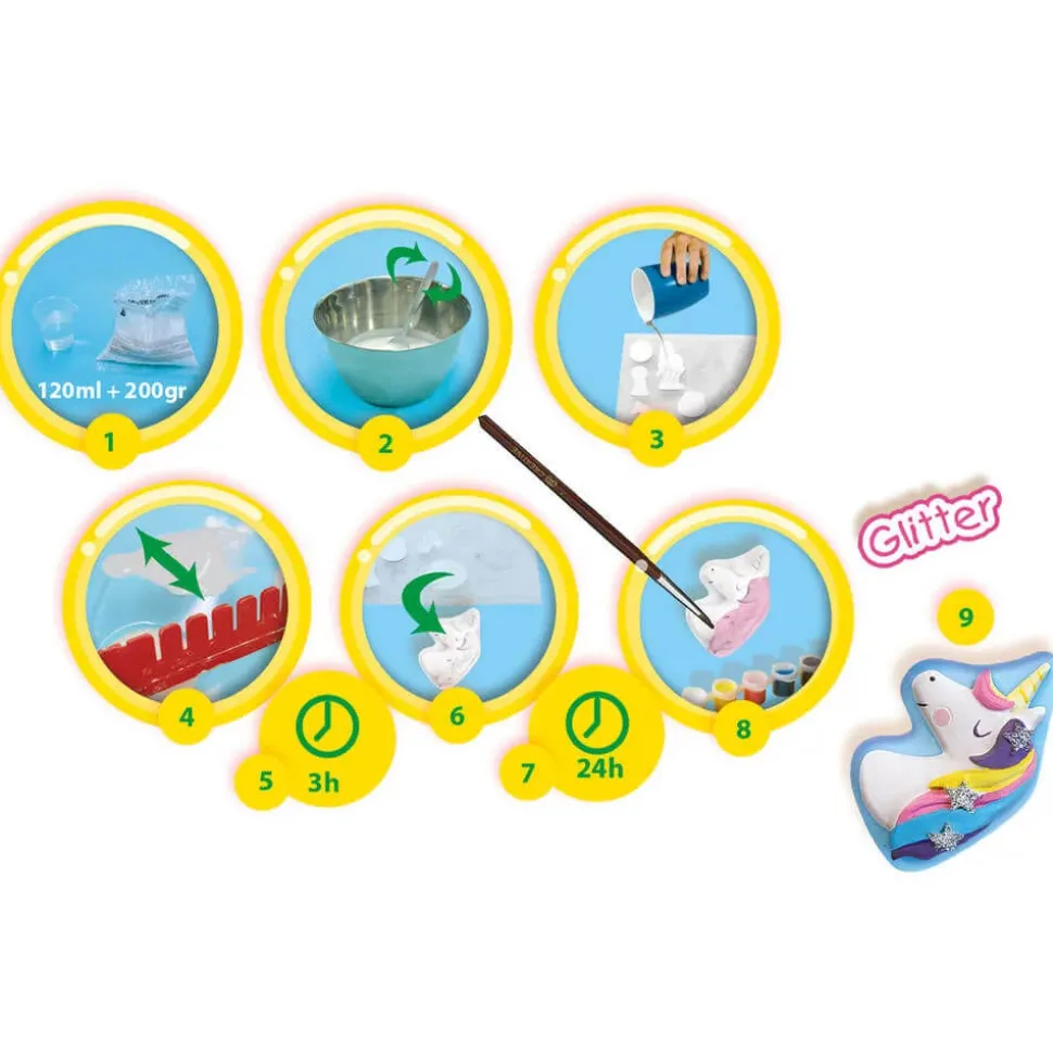 Avec ce kit signé SES Créative, vous pouvez fabriquer facilement toutes sortes de statues de licornes en plâtre. Très simple à utiliser, il suffit de verser le plâtre dans le moule et de le laisser durcir. Puis, utilisez la peinture fournie pour peindre les licornes dans vos couleurs préférées. C’est amusant à faire et le résultat est impressionnant !