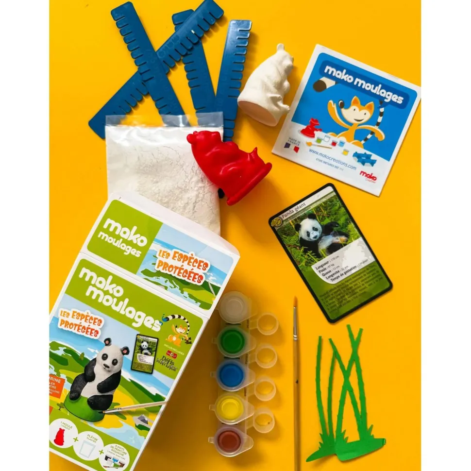 Contenu : 1 moule en latex l’espèce protégée panda géant, 1 sachet de 150g de plâtre, 4 pots de peinture (blanc irisé, jaune, noir, vert), 4 croisillons, 1 pinceau et 1 notice, 1 carte Défis Nature de Bioviva.