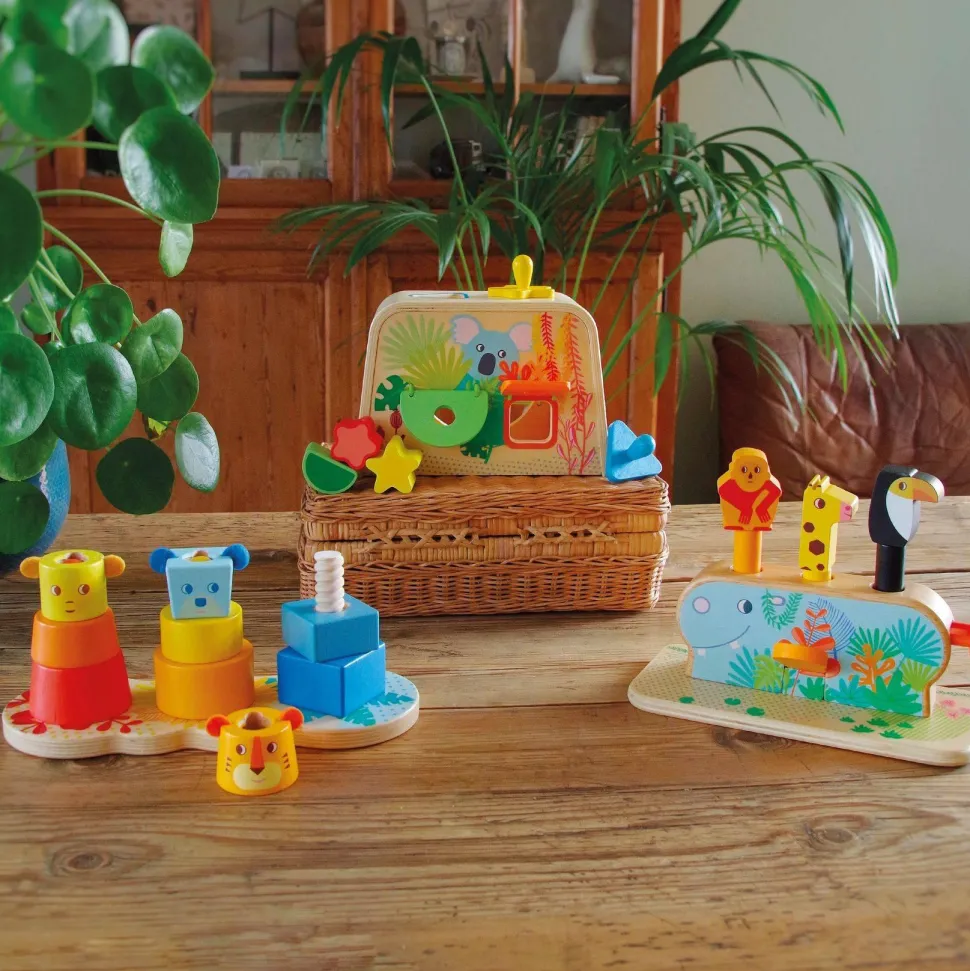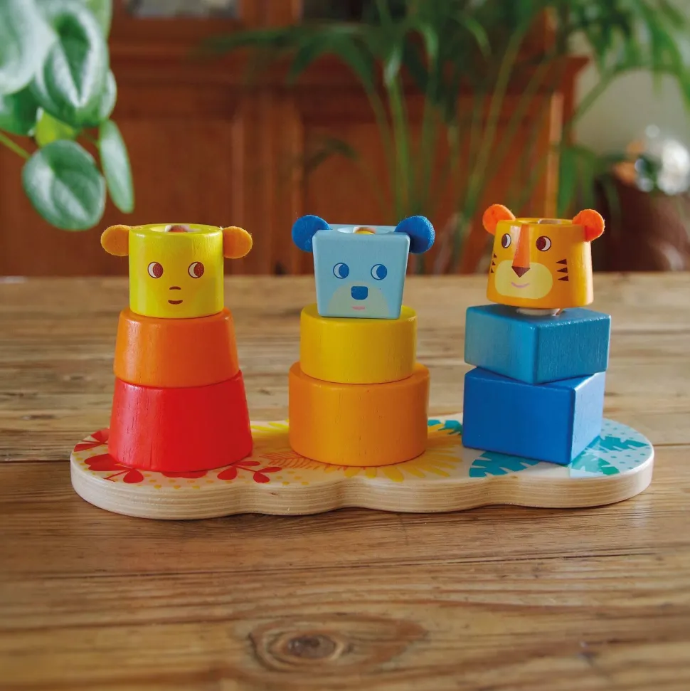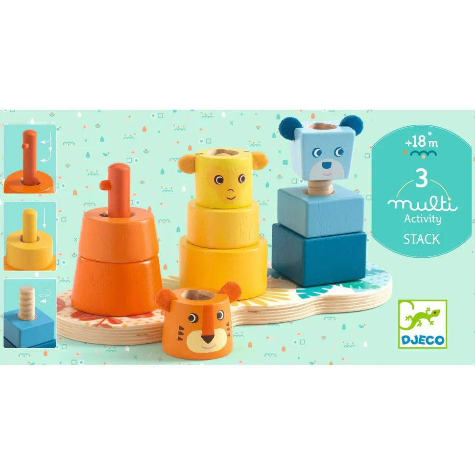 Découvrez le jeu Multi Stack de la marque Djeco. Multi Stack est un jouet en bois innovant qui permet à l’enfant de découvrir trois manières différentes d’empiler les pièces. Chaque pyramide représente un animal aux couleurs vives : un singe, un lion et un ours, chacun ayant une couleur dominante qui peut aussi servir à trier les couleurs. L’enfant apprend à empiler les pièces sur différents axes : un axe lisse pour empiler, un axe en spirale pour visser et un axe à clé pour pivoter. Ces actions variées rendent le jeu ludique et stimulant, tout en développant la motricité fine et la coordination. Les pièces sont conçues pour être utilisées sur tous les axes, permettant une grande variété de jeux et de manipulations. Ce jouet encourage l’enfant à explorer différentes façons de réaliser une action et à affiner ses compétences motrices tout en s’amusant.