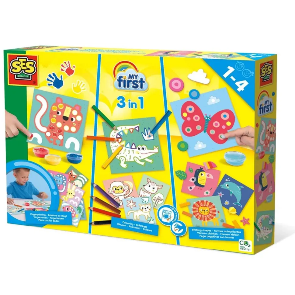 Description du produit : My first : 3 en 1 : Peinture au doigt, coloriage et formes autocollantes