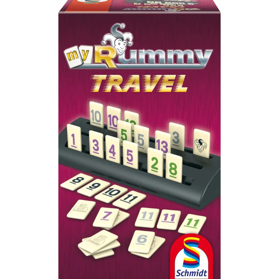 Le jeu My Rummy mais en édition voyage.Le but du jeu est de se débarrasser de ses pièces en posant des combinaisons d’au moins trois tuiles, soit de même couleur et dont les nombres se suivent, par exemple, 6, 7, 8 et 9 rouge soit encore de même valeur et de couleurs différentes, par exemple, 8 rouge, 8 bleu, 8 noir et 8 jaune. Les suites sont posées soit de gauche à droite soit de haut en bas.Plusieurs possibilités de combinaisons, stratégie, suspense et surtout, plaisir ! Un jeu pour toute la famille. A la fin du jeu, les quatre support des tuiles s’assemblent et servent de boîte de rangement.Durée moyenne d’une partie : 30 minutes.A partir de 8 ans.Nombre de joueurs : 2 à 4.Dimensions de la boîte : 11 x 18.5 x 7 cm.