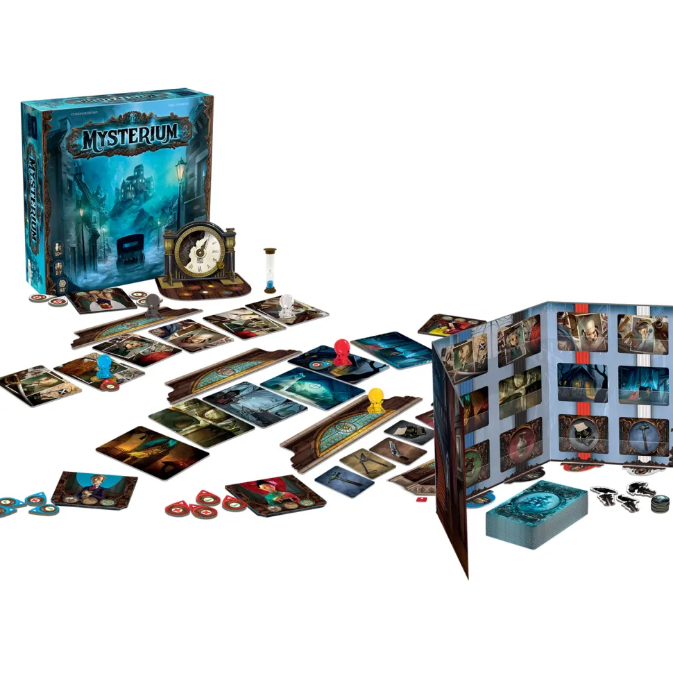 Oserez-vous franchir la porte du manoir hanté de Mystérium ?Un seul but : Élucider les circonstances de la mort du fantôme. En effet, les médiums devront essayer de comprendre les indices que leur laisse le fantôme à l’aide de 192 cartes illustrées. Ils devront tous s’entraider pour trouver le vrai coupable qui a tué ce fantôme ! Le temps est compté …Élu As d’or Jeu de l’année 2016, un jeu mystérieux, d’intuition et de réflexion.Durée moyenne d’une partie : 42 minutes.Nombre de joueurs : 2 à 7.Ce jeu contient : – Un livret de règles- 54 cartes médium- 6 pions intuition- 6 étuis- 36 jetons clairvoyance- 6 marqueurs niveau de clairvoyance- 1 piste de clairvoyance- 4 plateaux de progression- 1 plateau horloge- 1 paravent- 84 cartes vision- 54 cartes fantôme- 6 jetons fantôme- 3 marqueurs corbeau- 1 sablier