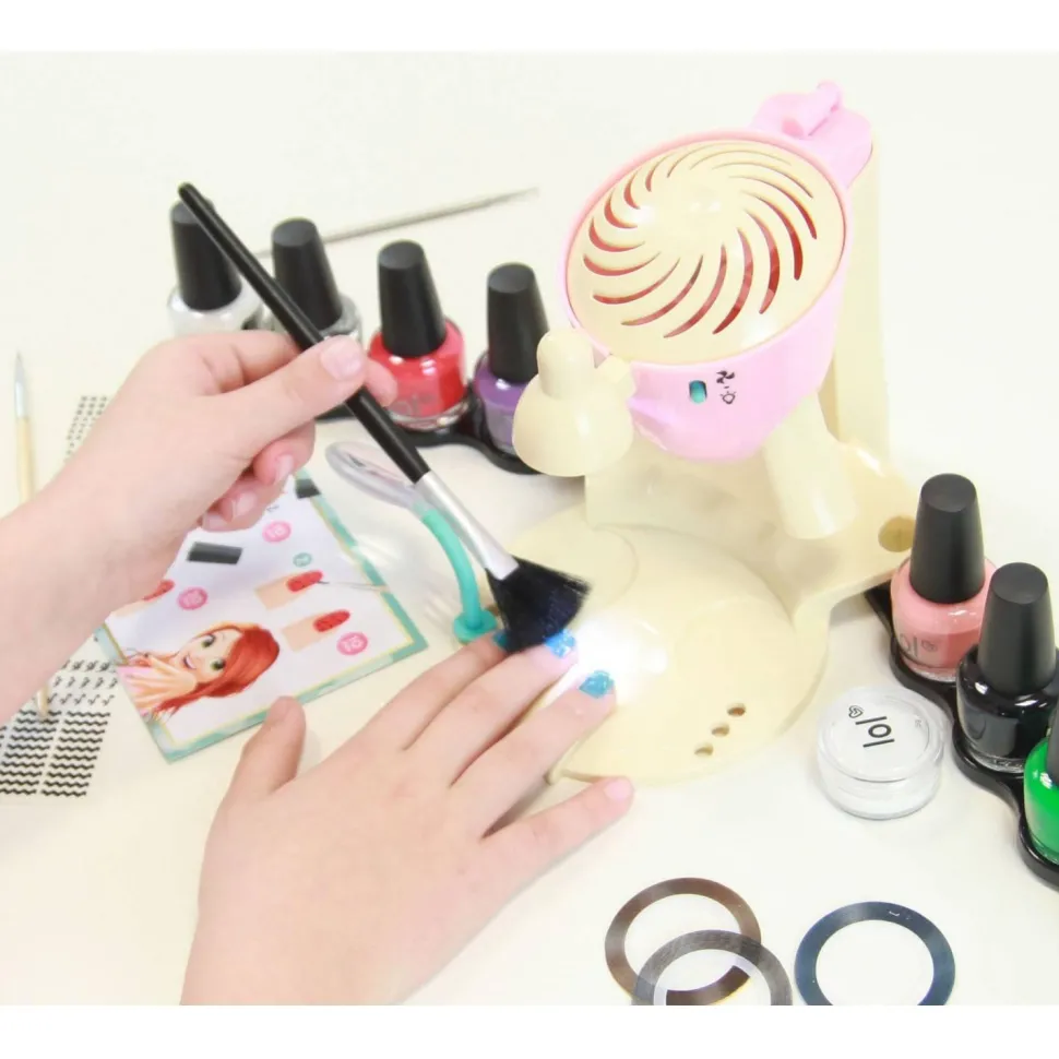 Un salon de manucure avec un espace pour caler le doigt sur lequel on travaille, un espace pour sécher les ongles plus rapidement, une loupe et une lumière pour travailler avec plus de précision !