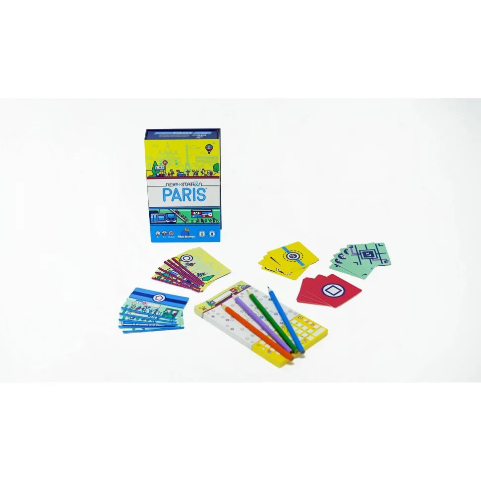 Contenu : 1 bloc de feuilles Plan de Paris, 4 crayons de couleurs (orange, vert, violet et bleu), 11 cartes Station : 6 cartes Rue (à fond jaune) et 5 cartes Souterrain (à fond bleu et vert), 5 cartes Objectif commun, 8 cartes Grandes Portes