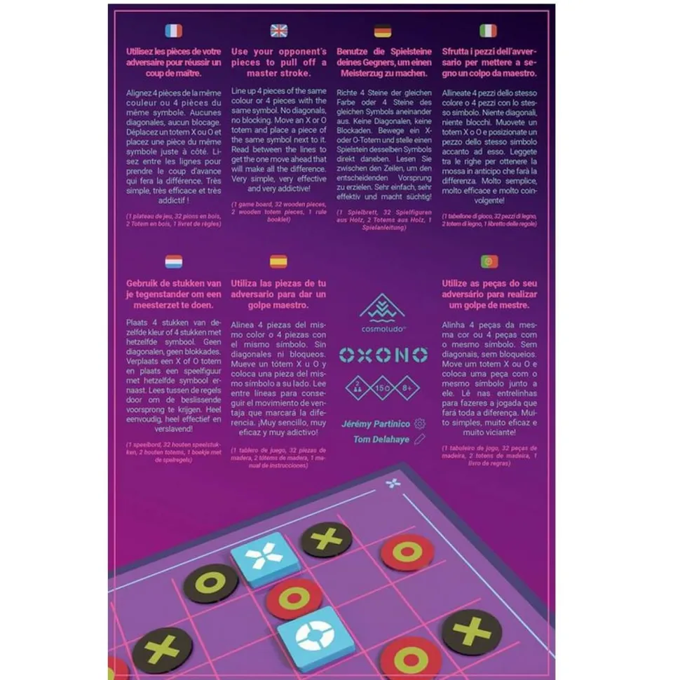 Les règles sont simples : le but est d’aligner 4 pièces de couleurs ou de formes similaires. À mi-chemin entre le puissance 4 et le morpion, Oxono vous fera réfléchir d’une nouvelle manière avec des mécaniques et une profondeur stratégique étonnante. La possibilité d’utiliser les pions adverses, l’utilisation de totem ou encore le placement libre d’une pièce dans certaines situations, offre 3 dimensions de réflexion rendant le jeu d’autant plus compétitif. Cependant, Oxono reste accessible à tous niveaux et engage les joueurs sur des parties rapides de 10 à 15 minutes. Attention à l’addiction !