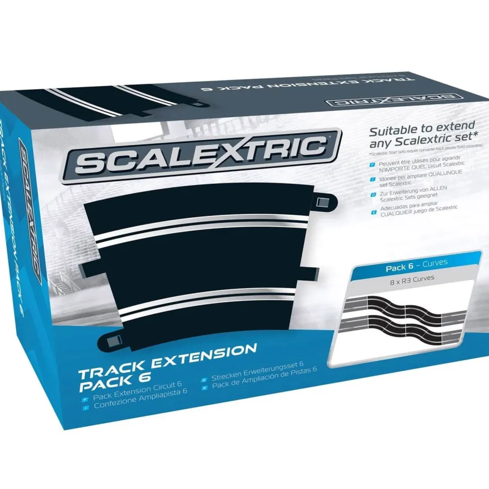 Scalextric propose 7 packs d’extension de piste pour compléter ses circuits.