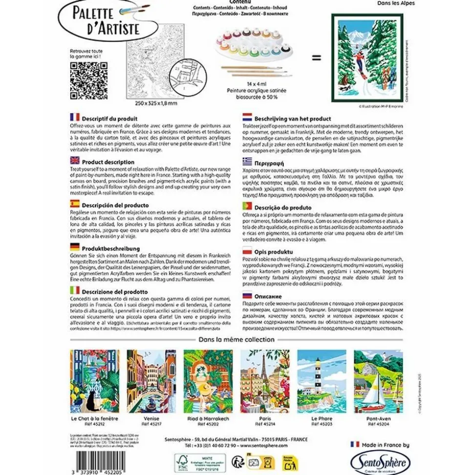 Contenu de la boîte : 1 tableau en carte toilée contrecollée (25 x 32,5 x 1,8 cm), Au minimum 13 couleurs de peintures acryliques non toxiques, Pinceaux de très grande qualité, 1 palette pour mélanger les peintures, 1 notice multilingue sur la perception des couleurs
