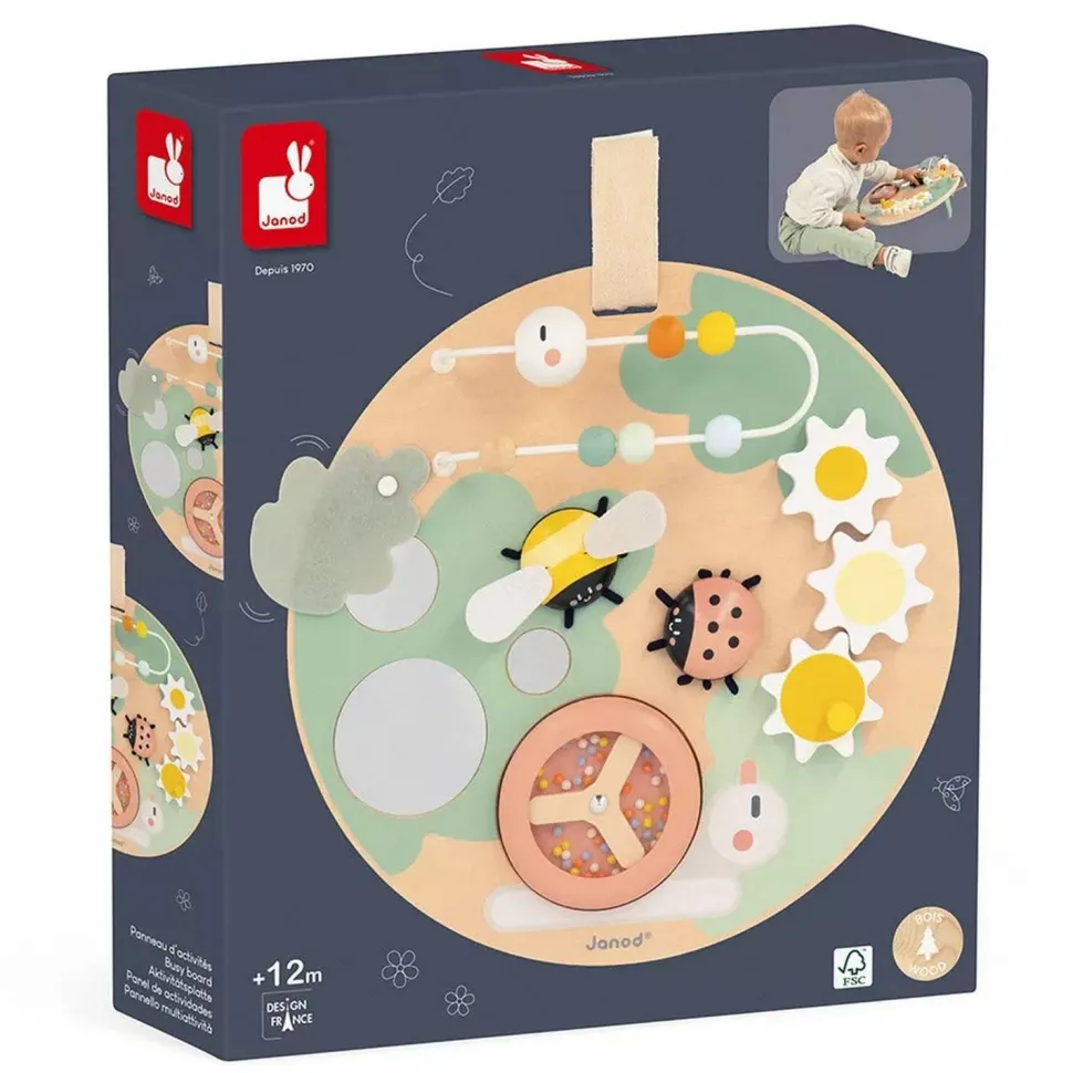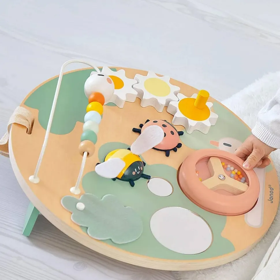 Une multitude d’activités à portée de main avec ce panneau d’activité aux couleurs douces de la marque Janod.