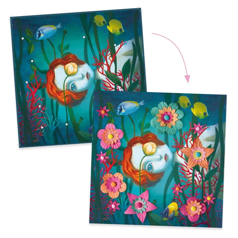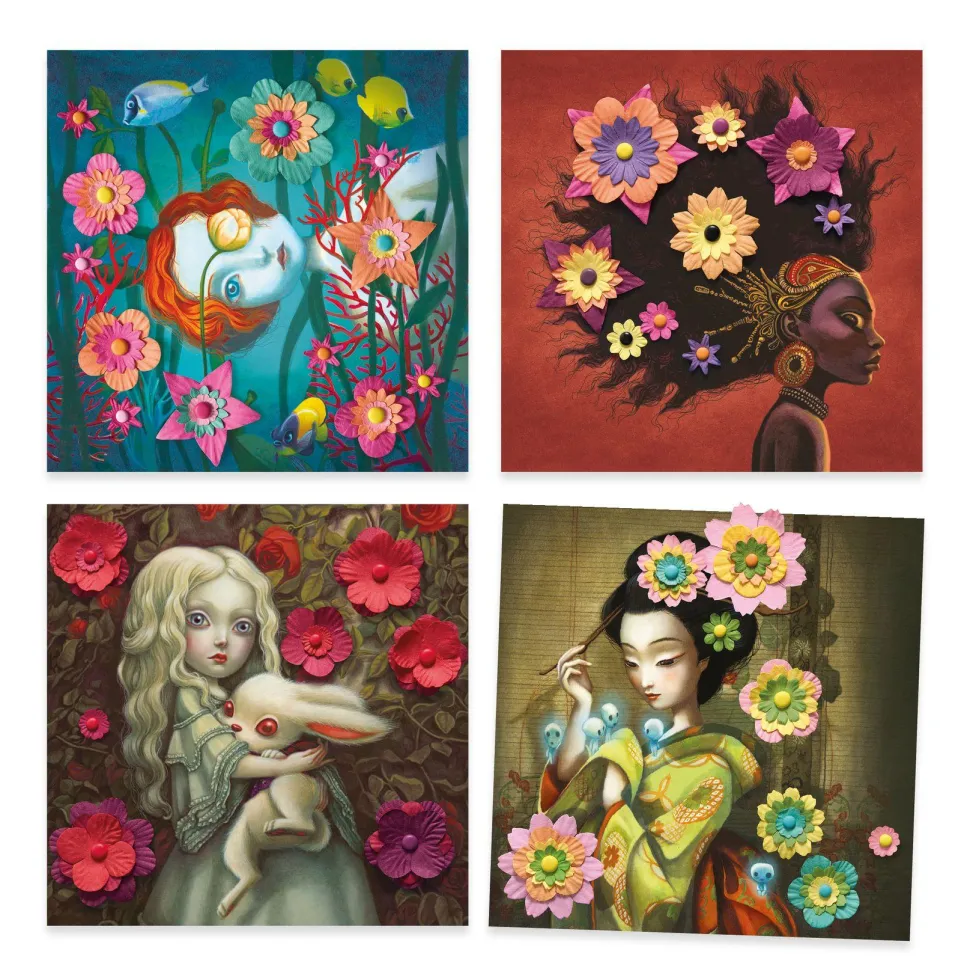 Le coffret contient : 4 planches illustrées et perforées (20 x 20 cm), plus de 100 corolles de papier, plus de 30 attaches parisiennes, et 1 livret pas-à-pas en couleurs.