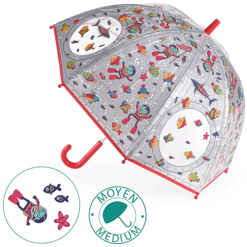 Un parapluie chic et pratique, pour découvrir la vie marine à travers les hublots comme dans un sous-marin ! Son ouverture manuelle dotée d’un système de protection permet à l’enfant de l’ouvrir et de le fermer sans se pincer les doigts. Un accessoire coloré, idéal pour égayer les sorties sous la pluie !