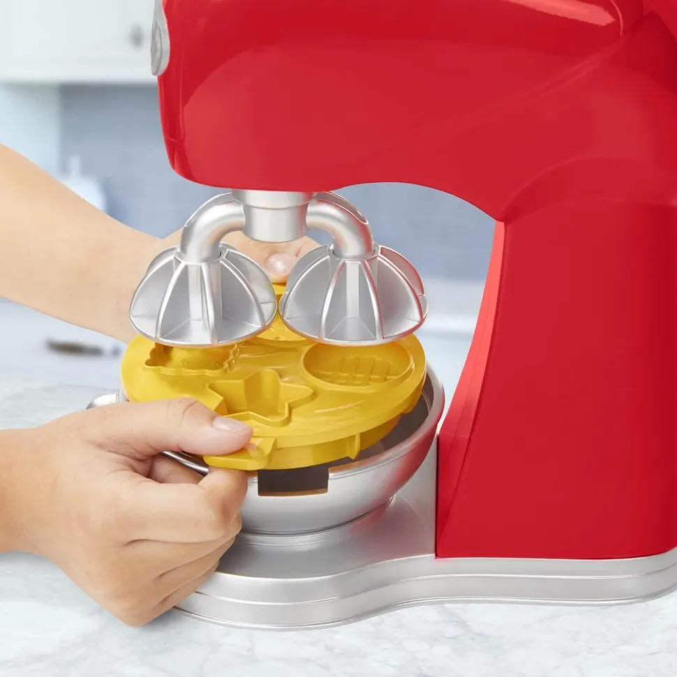 Il suffit de placer l’un des 2 plateaux-moules sur le bol amovible, de remplir les moules de pâte à modeler Play-Doh et d’appuyer sur la poignée pour créer des biscuits rigolos et des formes de gâteaux amusantes ! Ils peuvent ajouter des tourbillons de glaçage factice avec l’extrudeur ou la spatule et des vermicelles factices en utilisant les trous sur la poignée de la spatule et créer encore plus de bonbons, de garnitures et de décorations Play-Doh avec les demi-moules sur les côtés du mixeur.