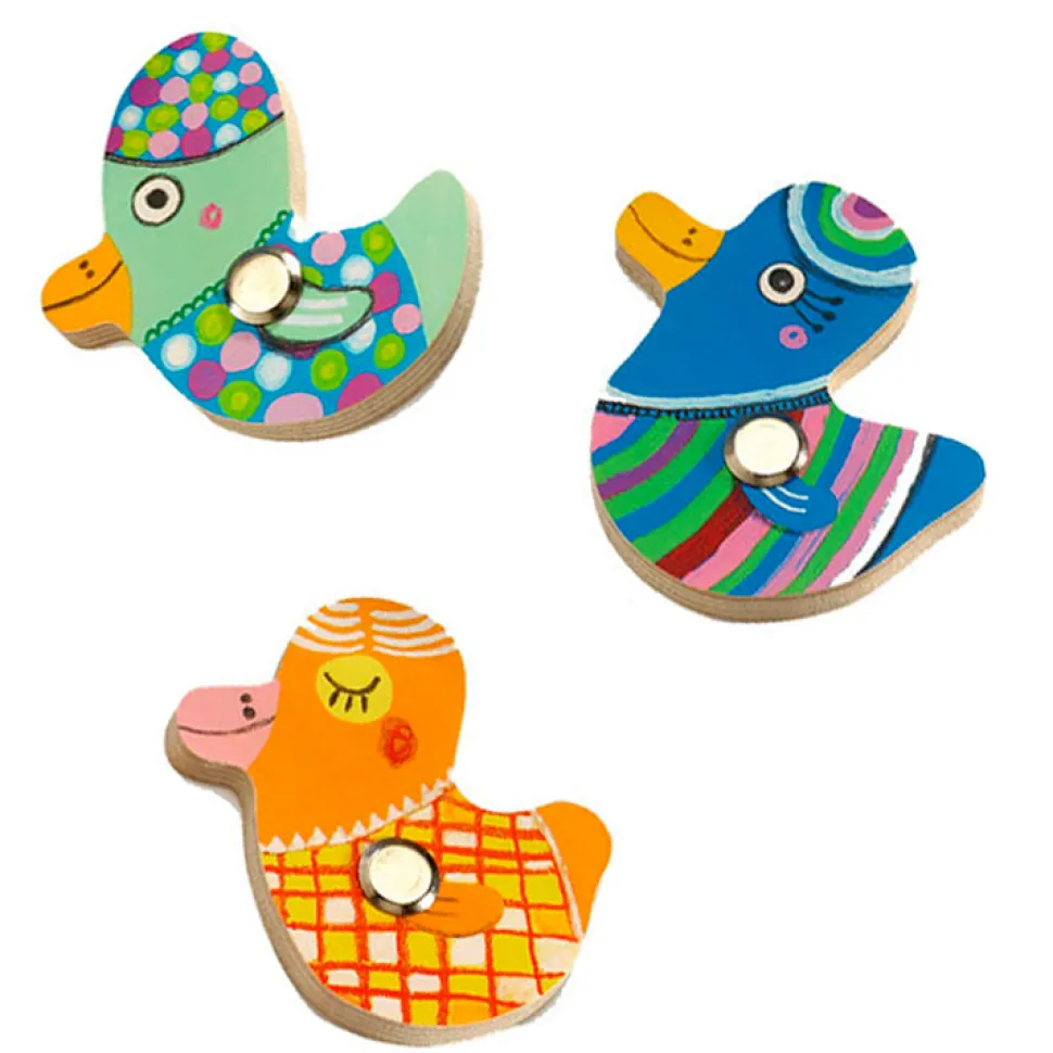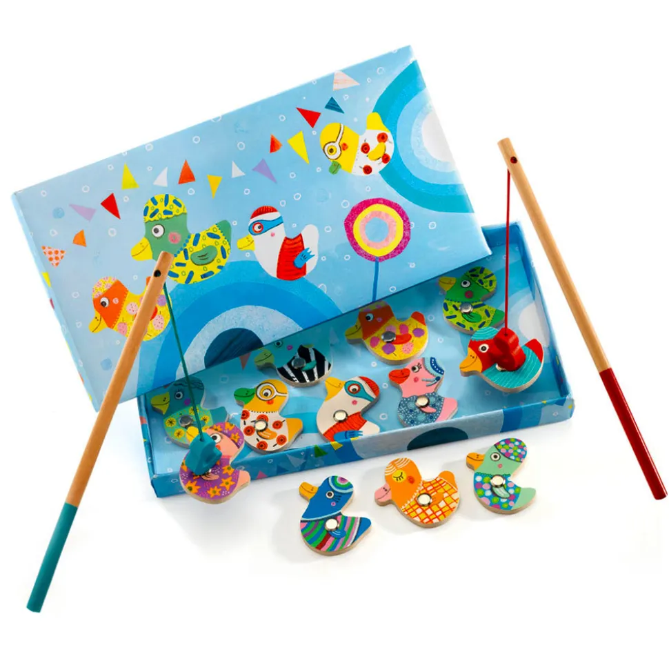 La pêche à la ligne, voilà bien un des jeux préférés des enfants, garçons et filles. Mais cette fois ce ne sont pas des poissons qu’il faut attraper, mais des canards aux looks aussi différents que rigolos ! Ce coffret contient : – 12 canards magnétiques en bois – 2 cannes à pêche Dimensions de la boîte : 28 x 15 x 2.5 cm.