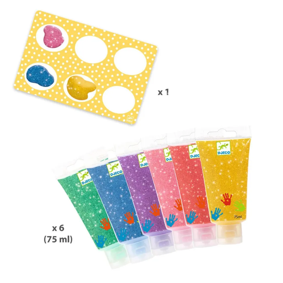 Contenu : 6 grands tubes de peinture à doigts paillettées (6 x 75ml) : Rose, doré, bleu, vert, violet, rouge. et 1 palette.