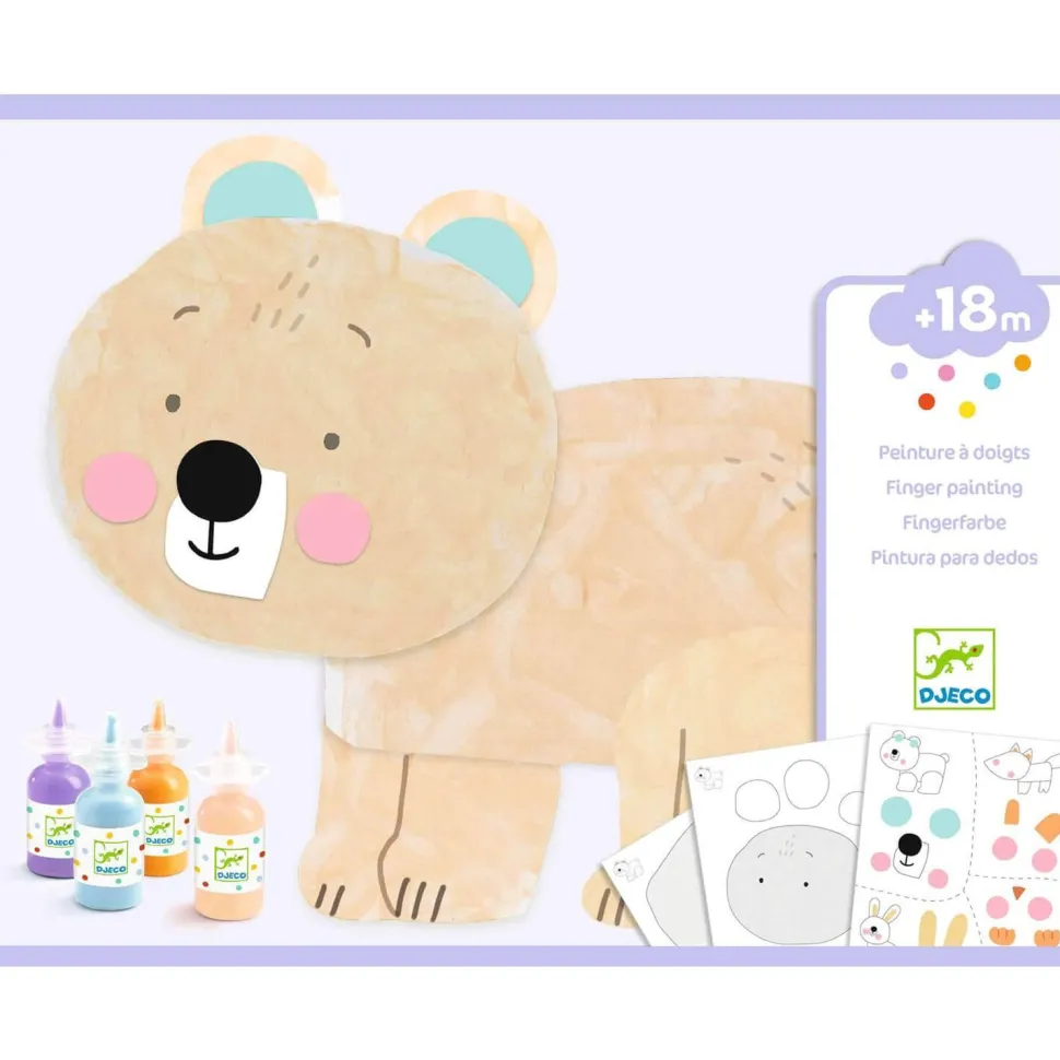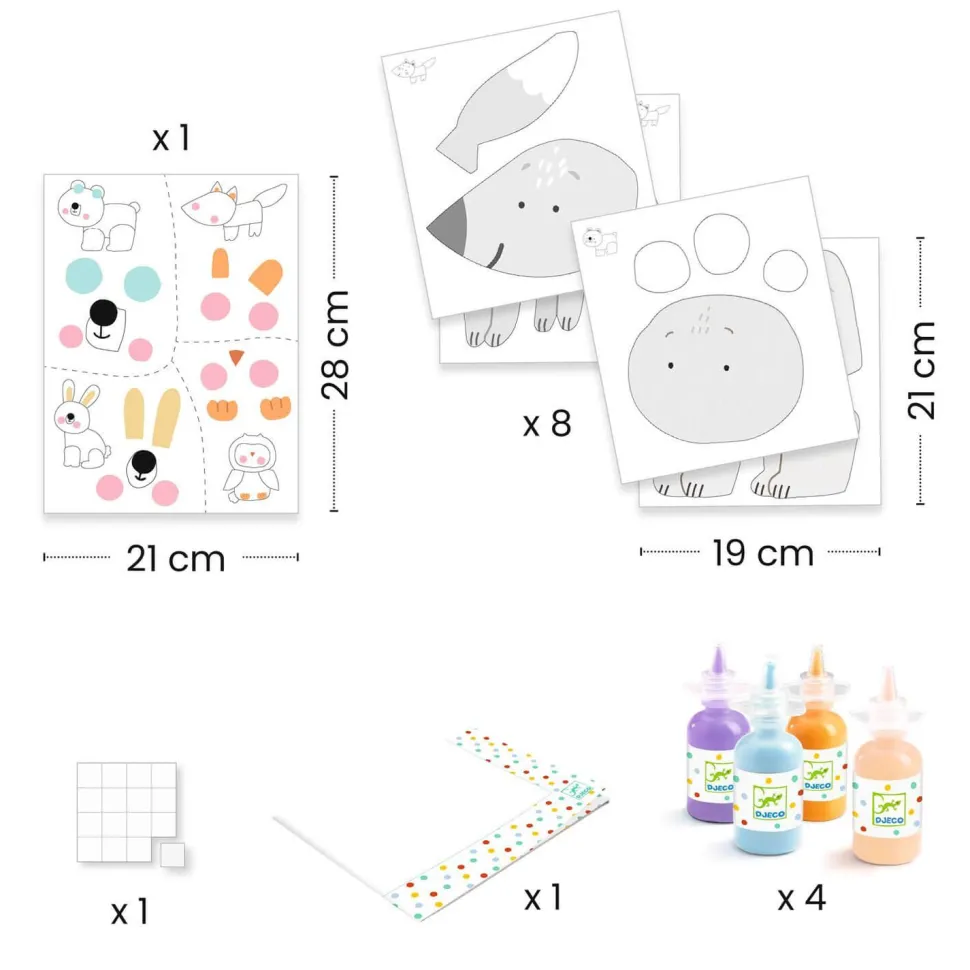 La marque Djeco présente Peinture à doigts, La patouille ! Une première activité de peinture dès 18 mois. L’adulte détache les formes et met de la peinture dessus. Au tour de l’enfant de mettre ses mains dans la peinture et de badigeonner les formes : on dit qu’il patouille ! Il assemble ensuite les formes et colle des autocollants. Il crée 4 animaux vraiment jolis en 2D. Contenu : 8 planches de carton épais, prédécoupées et illustrées. 1 planche de stickers. 4 bouteilles de peinture à doigts. 1 protection de table. 1 livret explicatif. A partir de 18 mois.