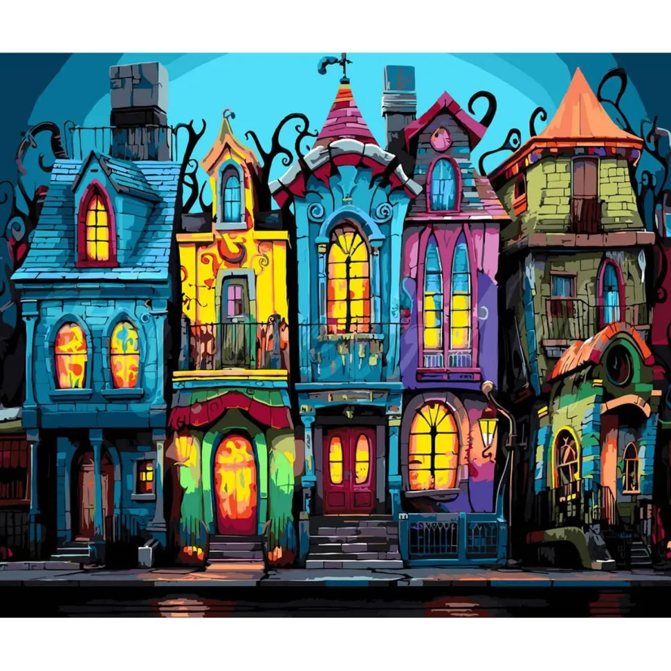 Peinture au numéro : Maisons gothiques colorées – sans châssis en bois
