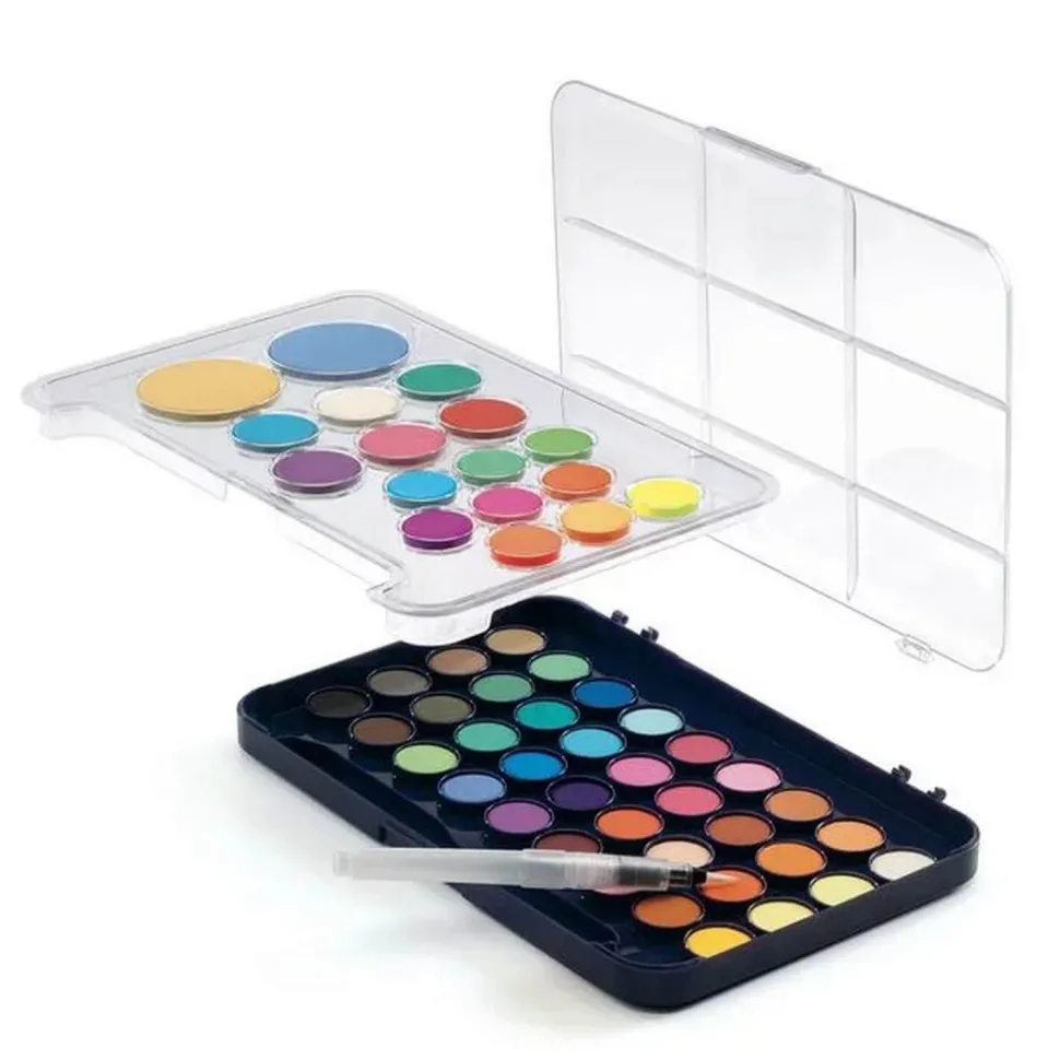 Voici une boîte de gouaches ultra complète qui présente une riche harmonie de pastilles réparties sur deux niveaux : 36 teintes standards, 8 nacrées et 9 couleurs fluo. Le plateau supérieur et la palette de mélanges sont amovibles. Ce kit comprend un pinceau à réservoir d’eau. De quoi équiper à la perfection votre apprenti artiste !