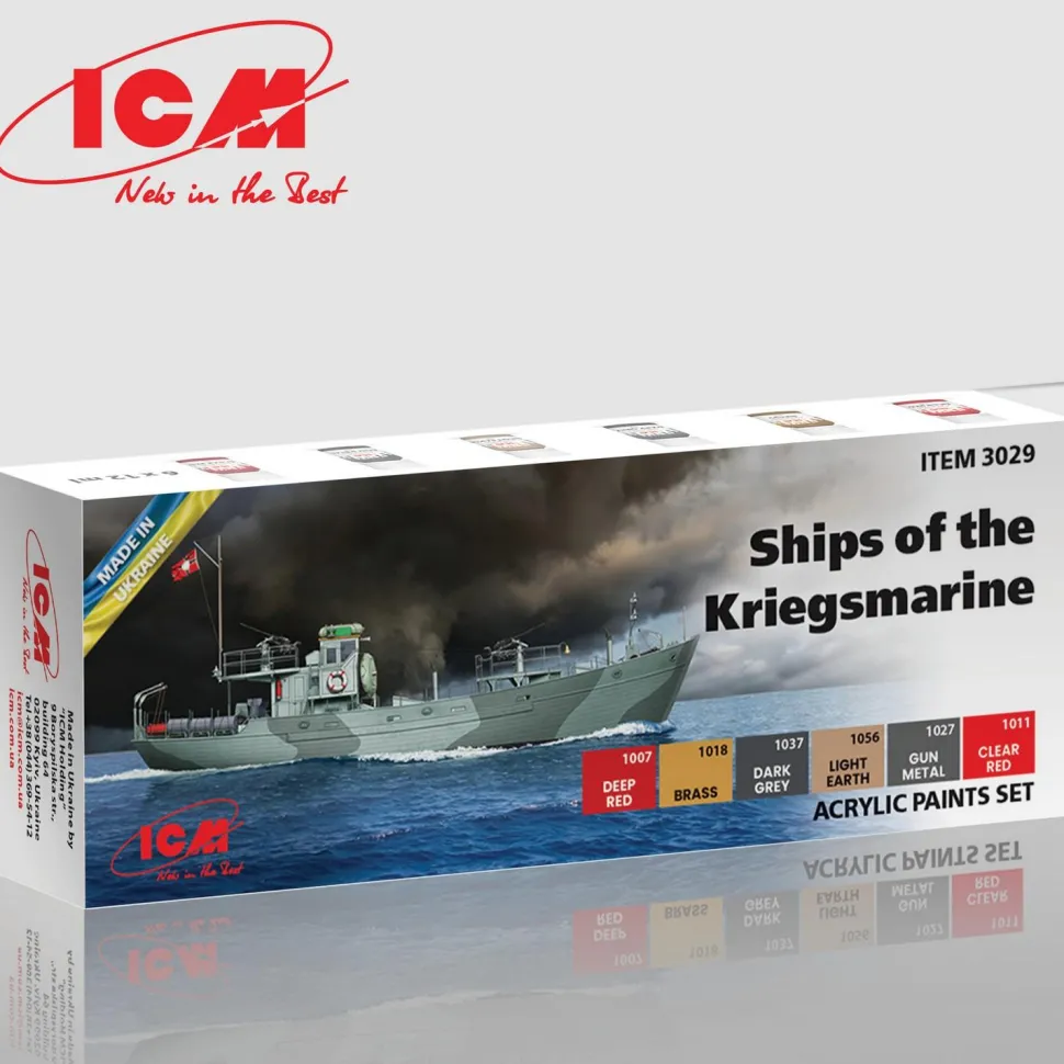ICM présente cet ensemble de 6 pots de peinture de 12 ml pour les maquettes de bateaux de la Kriegsmarine de la Seconde Guerre Mondiale.