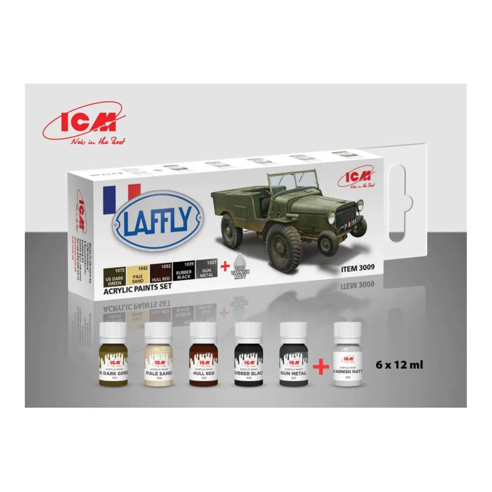 Set de 6 Peintures acryliques pour maquette de véhicule Laffly V15T et véhicules français de la Seconde Guerre Mondiale, de la marque ICM. Contenance : 12 ml.