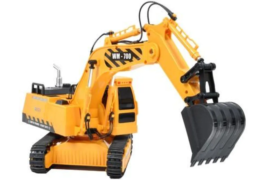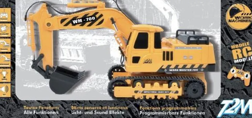 Avec cette pelleteuse radiocommandée, c’est vous le chef de chantier!Toutes fonctions :– Marche avant/arrière- Direction gauche/droite- Pivotement gauche/droite- Rotation de la tourelle (gauche/droite-360°)- Mouvements de la pelle (excavation/déchargement)Effets lumineux :– Feux rougesEffets sonores :– Son du moteur (mise en route et fonctionnement)- Klaxon – Bip (recul et rotation de tourelle)- Activation/Désactivation du sonFonctions programmables :– Mode démonstration- Mémorisation d’une séquence de mouvements et répétitionArrêt automatique après 60 secondes de non-utilisation.Retrouvez d’autres véhicules de chantier radiocommandés de la marque T2M sur notre site Internet, sous les références suivantes:- Camion toupie radiocommandé (ref. T2MRC-T703)- Camion grue radiocommandé (ref. T2MRC-T702)- Camion benne radiocommandé (ref. T2MRC-T701)