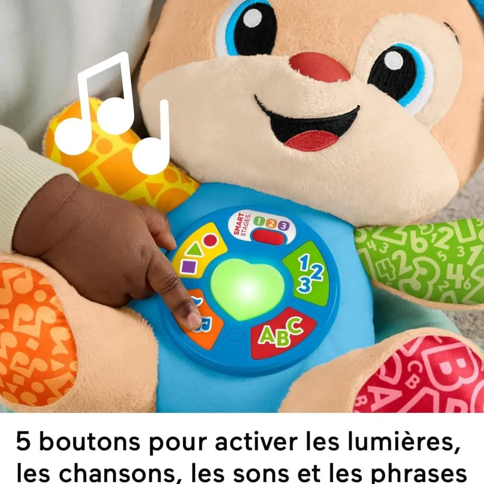 Les tout-petits peuvent appuyer sur les 5 boutons du ventre de Puppy pour voir son cœur s’illuminer de différentes couleurs et entendre plus de 80 chansons, sons et phrases. Avec plus de 12 chansons originales et 3 niveaux d’apprentissage Éveil Progressif pour faire évoluer le contenu éducatif à mesure que bébé grandit, Puppy Éveil Progressif va sans doute devenir le meilleur ami de votre enfant !