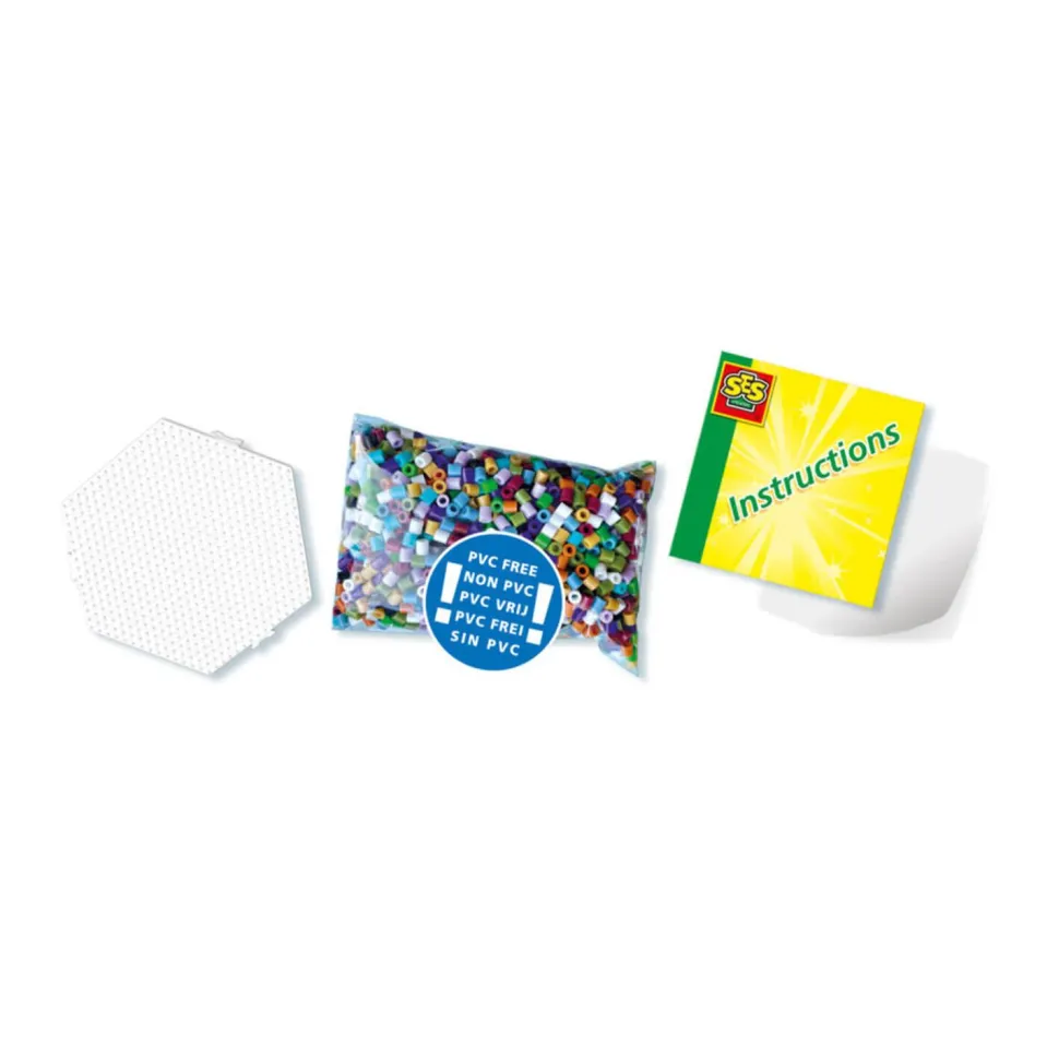 Contenu : Plaque hexagonale pour perles à repasser, Sac contenant 2100 perles à repasser, Papier à repasser, Instructions.