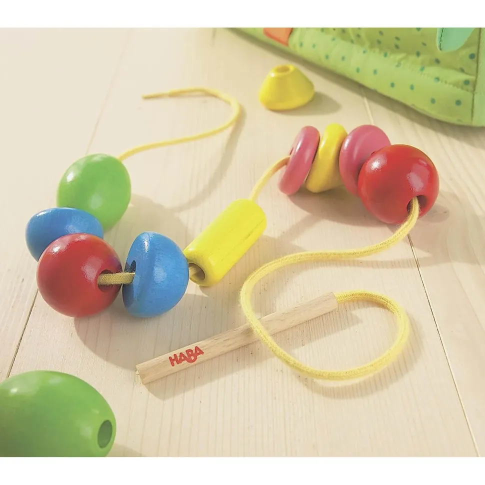 Perles BambiniDéveloppe la motricité. Contenu : – 12 pièces en bois à enfiler – 1 aiguille en bois – 1 cordelette