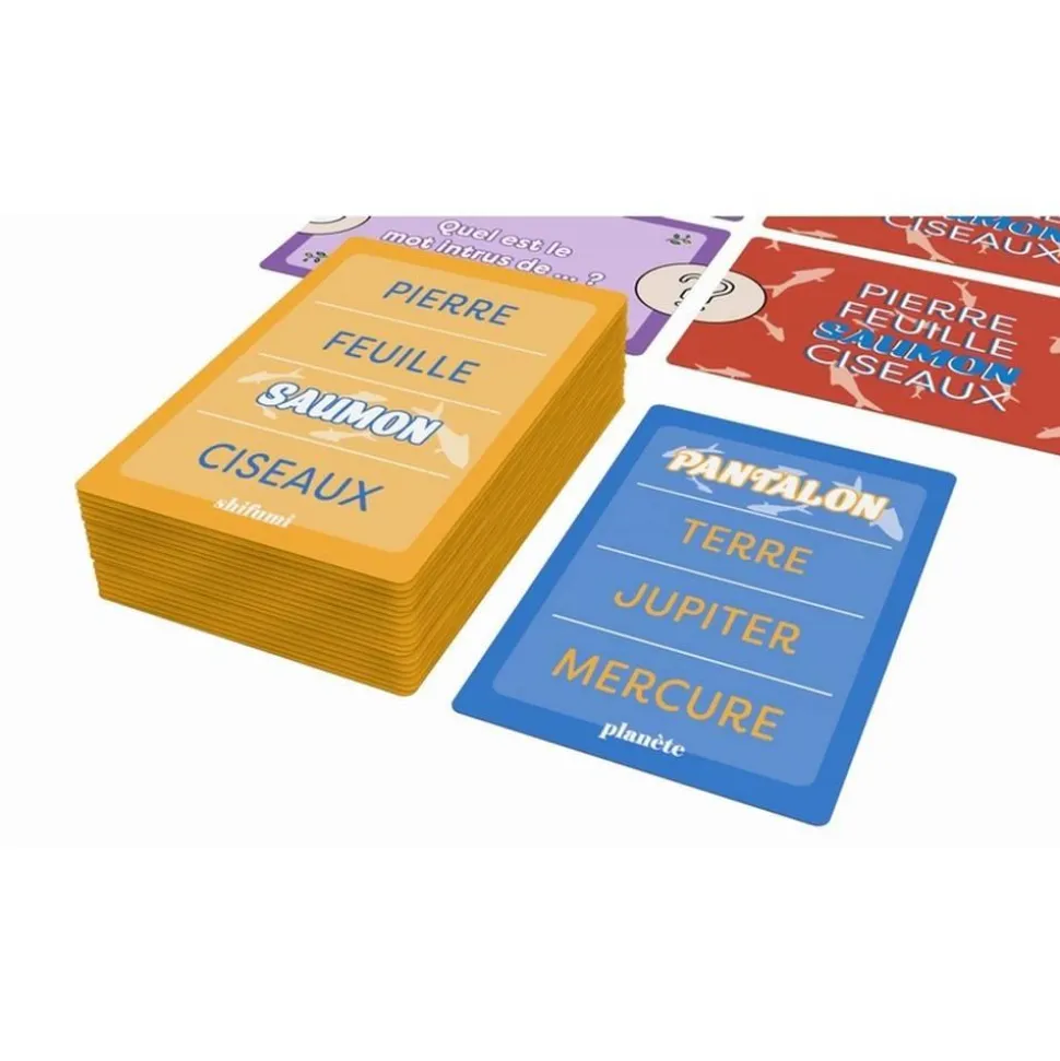 Un jeu coopératif absurde ! Chaque joueur pioche une carte, elle comporte 4 mots dont un intrus…A tour de rôle, chacun lit à voix haute le premier mot de sa carte, puis on lit les deuxièmes, les troisièmes et les quatrièmes. Retenez les mots de vos coéquipiers, et répondez aux questions qui vous seront posées. Les missions vont devenir de plus en plus corsées…