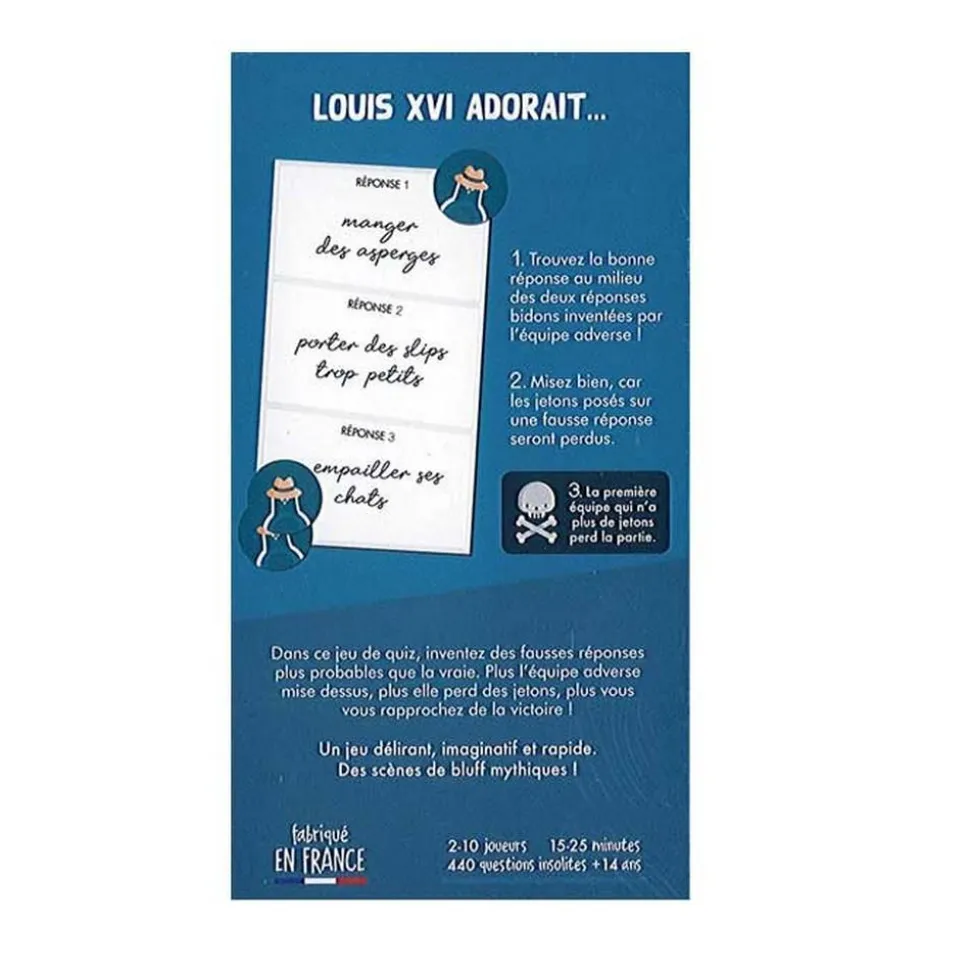 Dans ce jeu de quizz, inventez des fausses réponses plus probable que la vraie. Plus l’équipe adverse mise dessus, plus elle perd des jetons, plus vous vous rapprochez de la victoire !