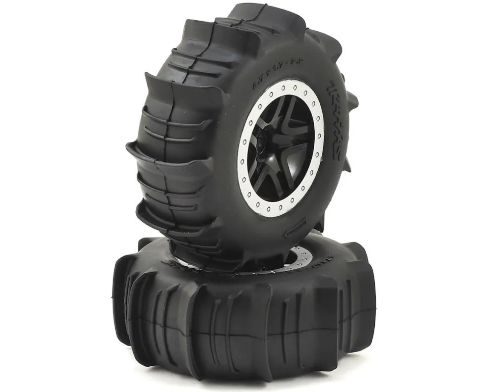 Description du produit : Pneus + Jantes Satin Chrome Beadlock Style Pneus Pelle (2) – Traxxas