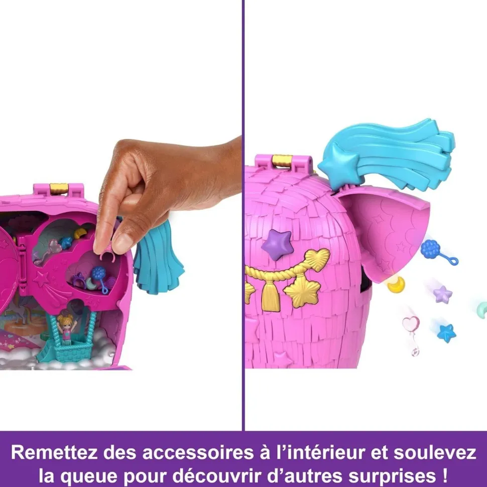 Célébrez le 35ème anniversaire de Polly Pocket avec le coffret Les licornes font la fête de la marque Mattel. Commencez la fête avec deux mini-figurines et plus de 25 accessoires, dont des licornes. La plus « popo-pulaire » des fêtes ! Avec deux façons uniques de découvrir les accessoires, les enfants vont adorer les sacs « vomi » arc-en-ciel qui tombent de la bouche de la licorne et les accessoires « popo surprise » qui apparaissent lorsqu’ils relèvent sa queue ! Les surprises peuvent être remises en place pour des heures et des heures de jeu. La partie extérieure de la licorne-pinata fêtarde s’ouvre et laisse place à une fête magique où les poupées peuvent faire un tour en montgolfière, faire de la balançoire à tour de rôle et partager une part de gâteau dans le parc. La fête ne s’arrête jamais avec Polly Pocket et ses amis ! Idéal pour les enfants à partir de 4 ans, surtout ceux qui adorent les arcs-en-ciel, les licornes et les surprises. Les couleurs et les décorations peuvent varier.