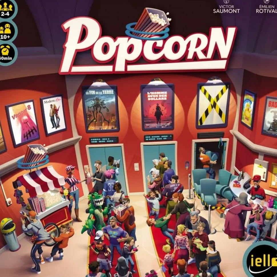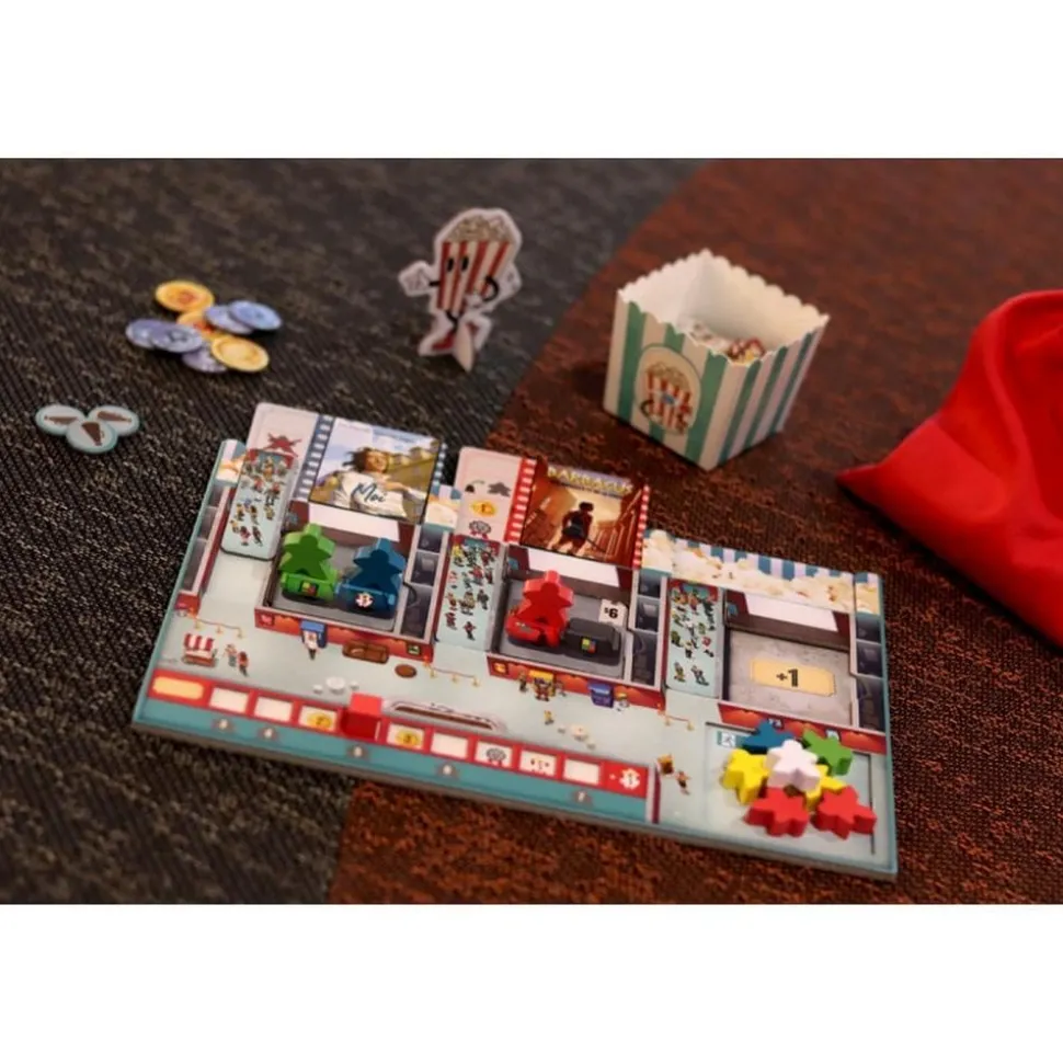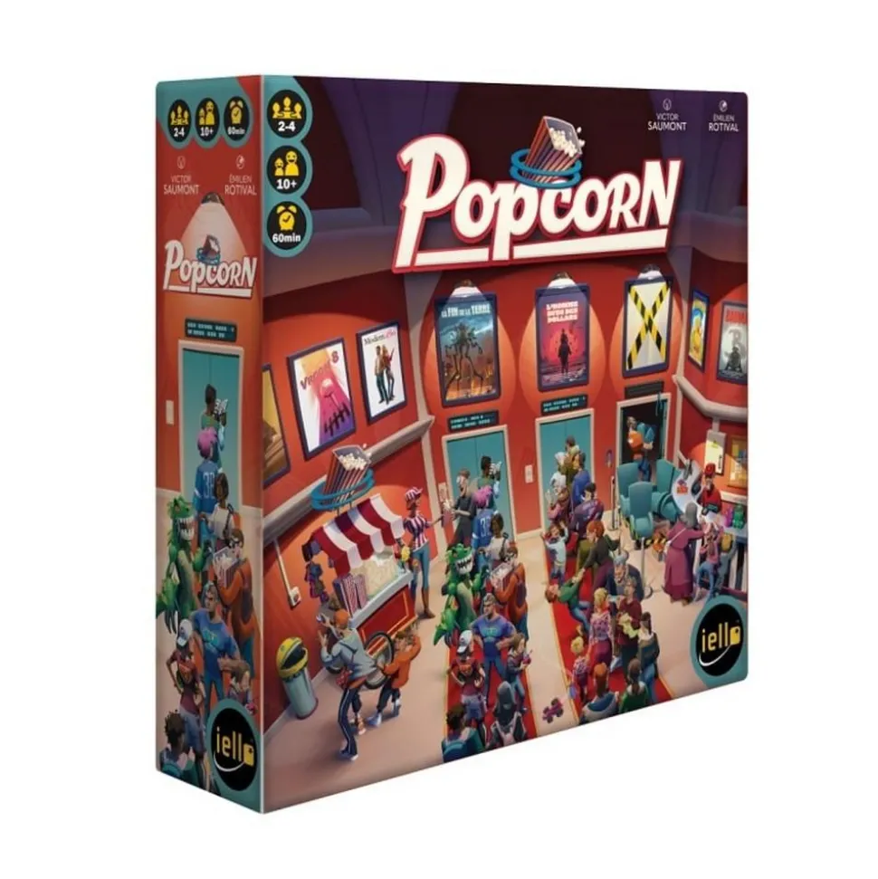 Dans Popcorn, chaque joueur incarne un directeur de cinéma en quête de succès. À vous de proposer la meilleure programmation en sélectionnant astucieusement nouveautés et avant-premières tout en développant vos salles pour optimiser votre activité. Chaque film projeté déclenche des effets stratégiques à exploiter pour attirer toujours plus de spectateurs et maximiser vos profits ! Le jeu se déroule en neuf manches, au cours desquelles vous devrez composer avec les attentes du public. Chaque session commence par un tirage de spectateurs depuis votre sac : positionnez-les judicieusement dans votre salle pour activer des effets spéciaux et booster vos revenus. Associez-les aux bons films pour obtenir des bonus supplémentaires : argent, nouveaux spectateurs, effets publicitaires, ou même la possibilité de perturber la concurrence !