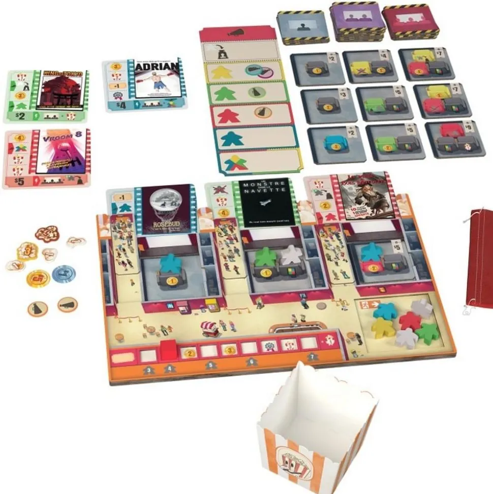 Contenu : 48 cartes Film, 4 plateaux Cinéma, 4 sacs en tissu, 4 pots à Popcorns, 28 tuiles Salle, 26 cartes Label, 60 pions Spectateur, 2 trophées Salle, 1 pion Premier joueur, 1 plateau et 12 jetons Réclame, 2 tuiles Films et des jetons Dollar et Popcorn… beaucoup de jetons Popcorn.