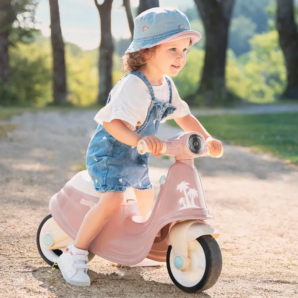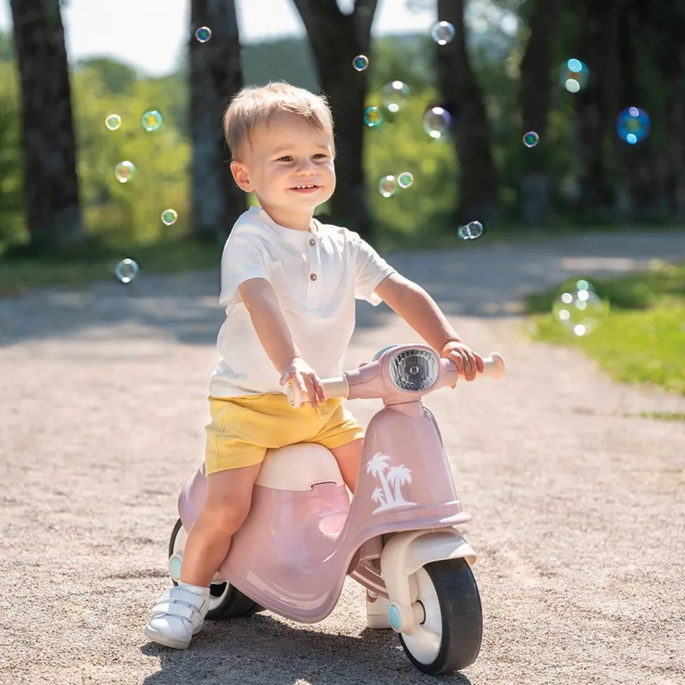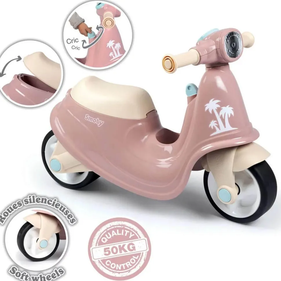 Grâce à ses roues silencieuses, votre enfant va pouvoir s’amuser et se balader tranquillement. Le scooter est muni d’un phare avant réaliste et d’une clé mécanique pour pouvoir s’inventer des histoires comme les grands. Il est en plus doté d’un coffre situé sous le siège pour pouvoir emmener ses compagnons de jeu en balade.