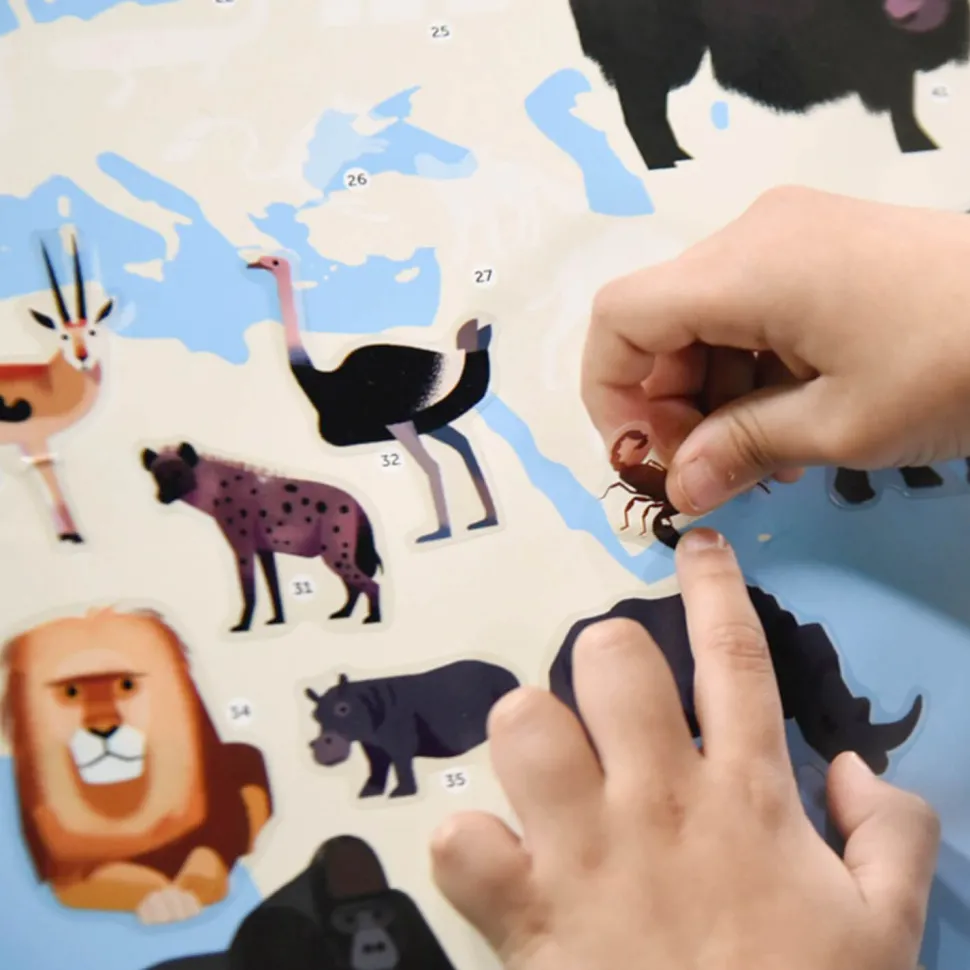 Découvrez une activité ludique passionnante sur les animaux du monde avec ce poster pédagogique et ses 67 stickers à positionner de la marque Poppik.