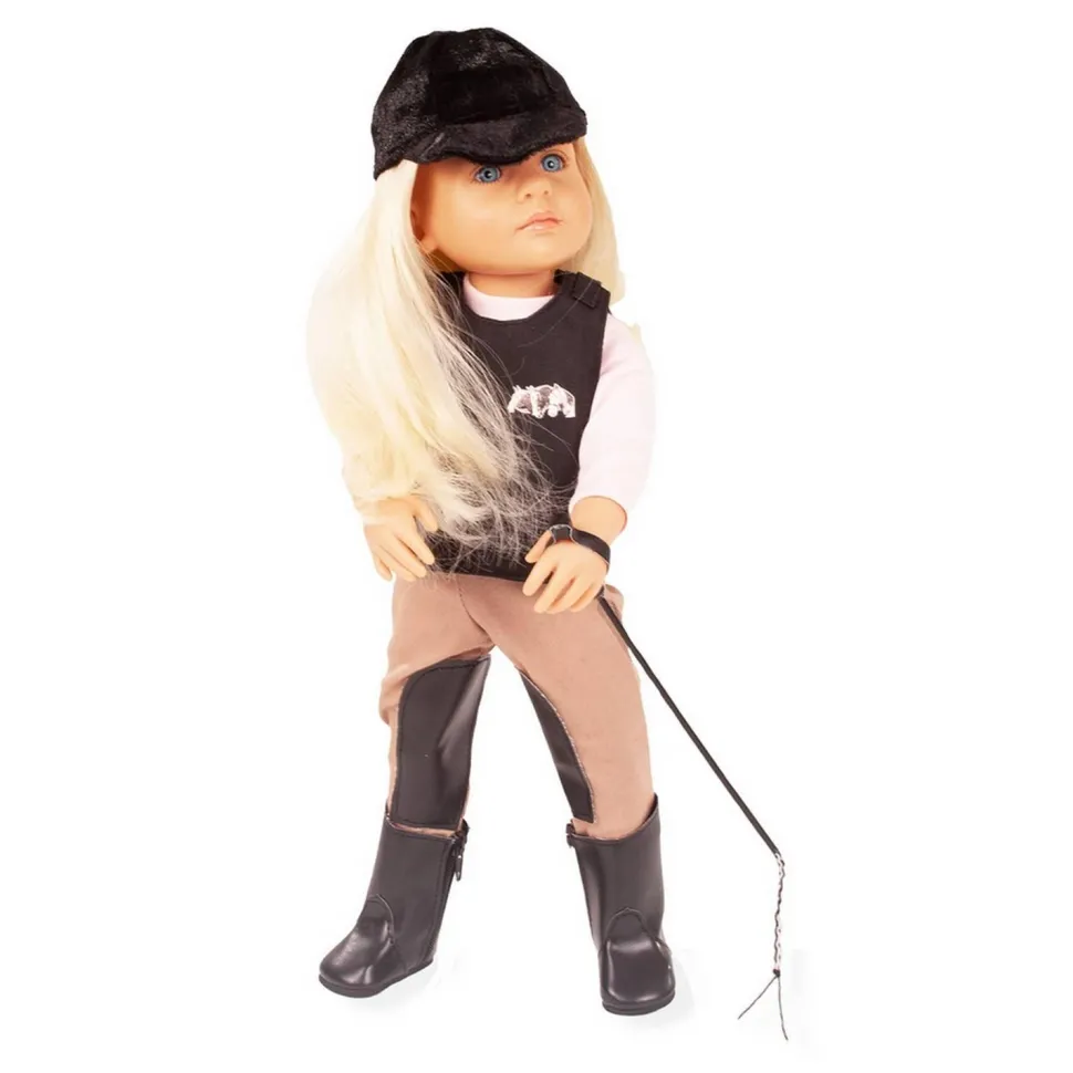 Contenu : Un poupée Little Kidz, cheveux bruns (environ 490 g), une Grenouillère, des Chaussons, des Pinces à cheveux, une Robe à paillettes, un Bandeau, des Ballerines, un Pantalon d’équitation, un T-shirt à manches longues, un Gilet d’équitation, une Cravate, un Casque d’équitation, des Bottes d’équitation.