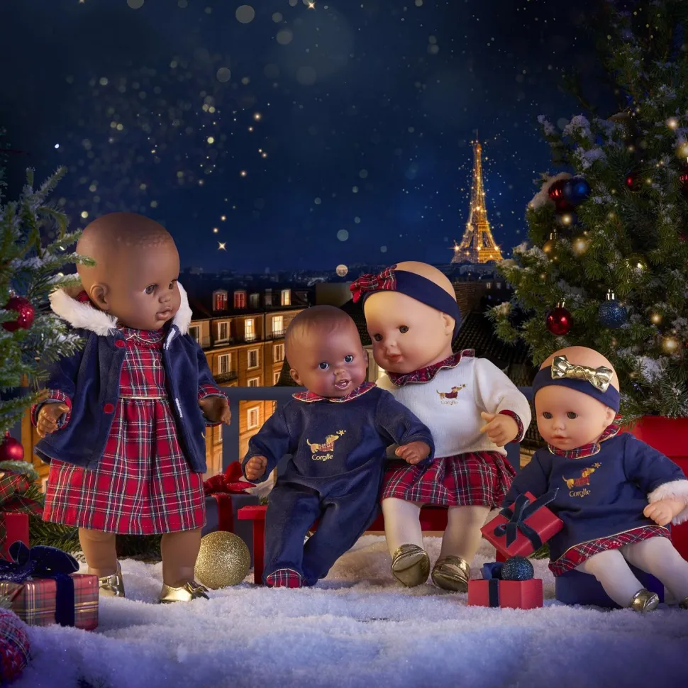 Bébé Calin Margaux Corolle en Fêtes est un petit poupon à la peau claire et aux yeux marron.