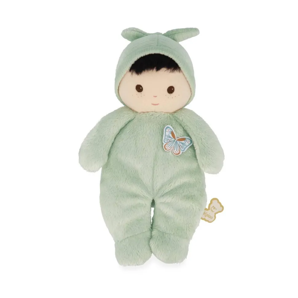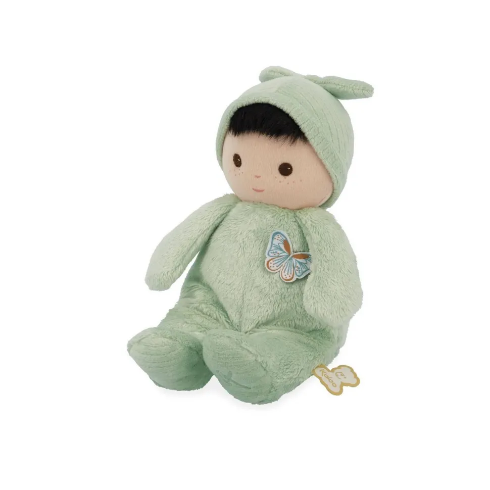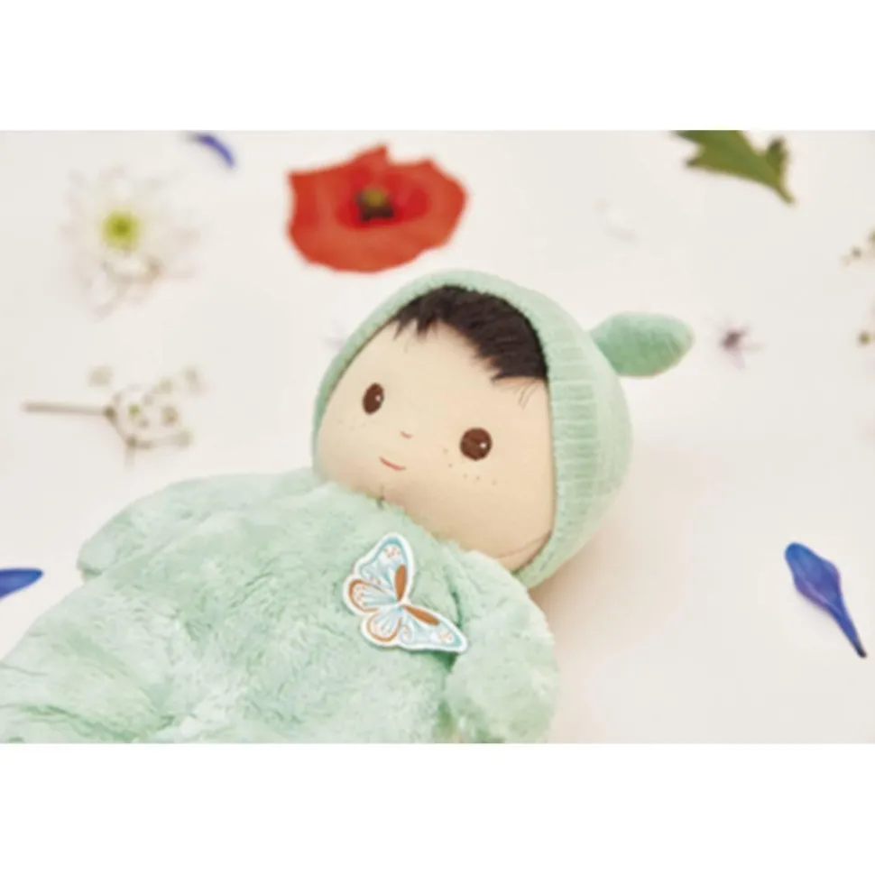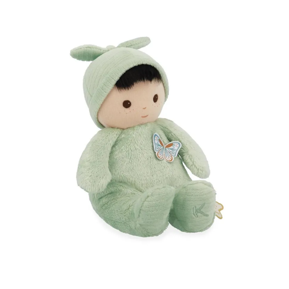 Cet adorable poupon brun de 24 cm se distingue par son corps de couleur verte et ses yeux marron intenses. Composé de micro-velours tout doux, de velours côtelé, et rembourré avec du polyester recyclé, ce poupon en tissu offre une texture douillette qui invite à de tendres câlins.