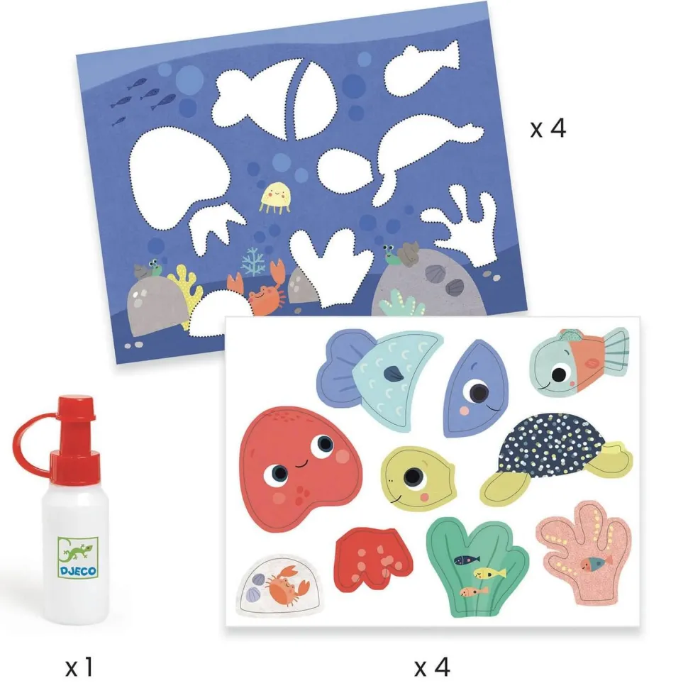 Une première activité de collage pour les tout-petits, dès 18 mois. Des formes épaisses faciles à détacher, à coller sur les jolies illustrations, pour réaliser 4 tableaux. Les grosses pièces en carton épais sont prédécoupées pour faciliter la prise en main et pour les détacher par les petites mains des enfants.