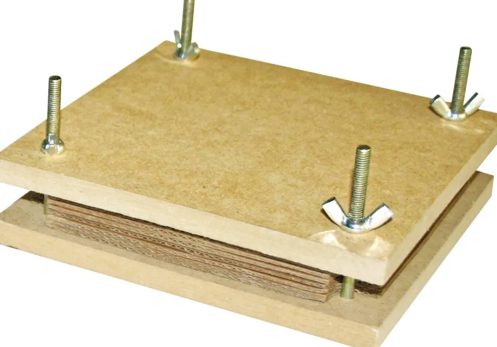 … Insectes, feuilles et fleurs seront préservés grâce à cette presse. Les plantes sont placées dans le papier absorbant fourni, entre les 8 couches de carton. Une fois serrées, les vis à oreilles exercent une pression sur les deux pièces de bois carrées, comprimant ainsi les 8 couches d’un coup.