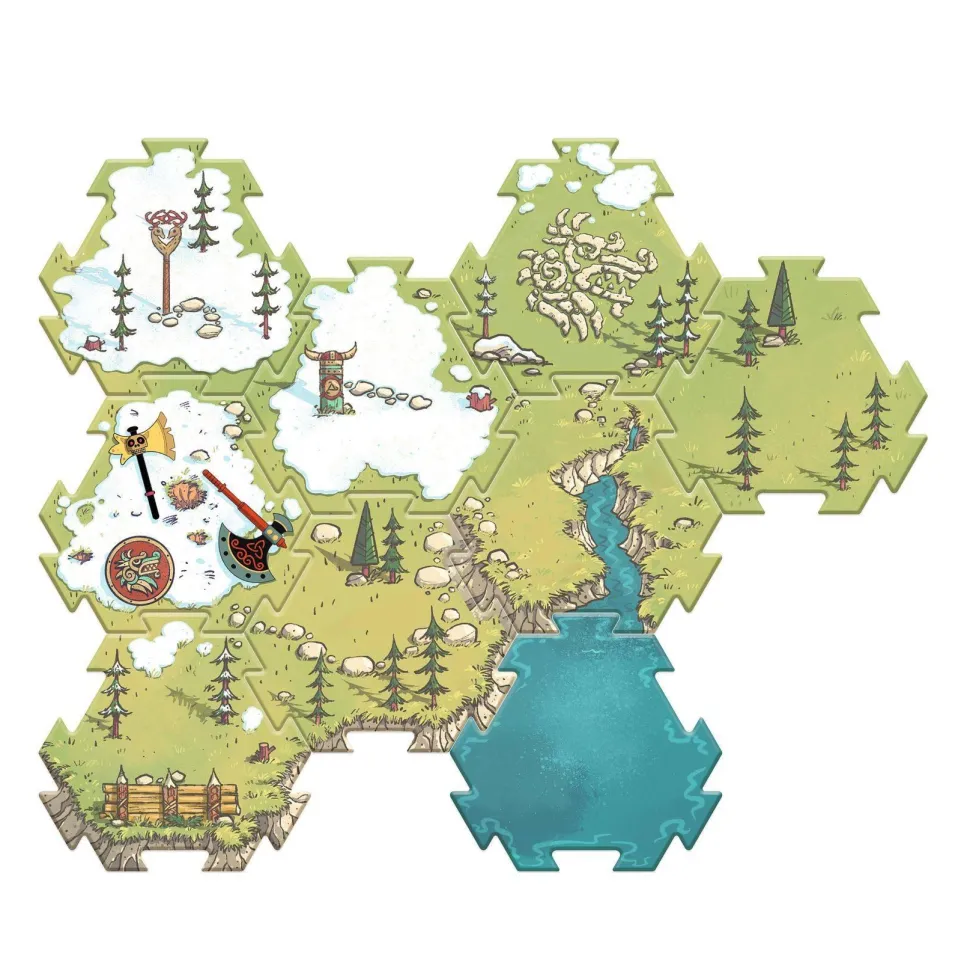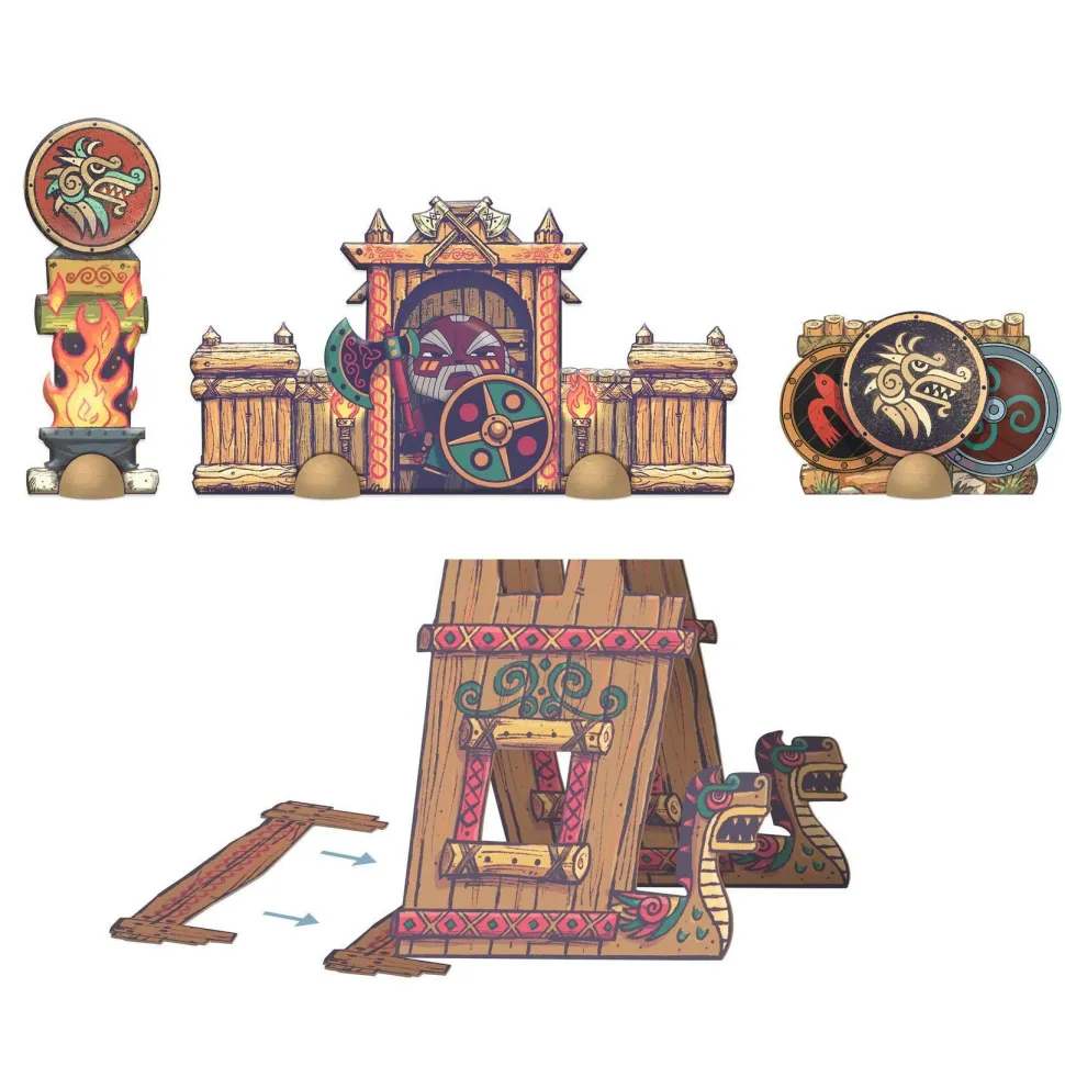 Contenu : 1 figurine + 2 accessoires + 1 puzzle de sol de 8 pièces + 4 éléments de décors montés sur des pions en bois : 1 totem + 1 support d’armes, 1 abri, 1 lieu de rassemblement.