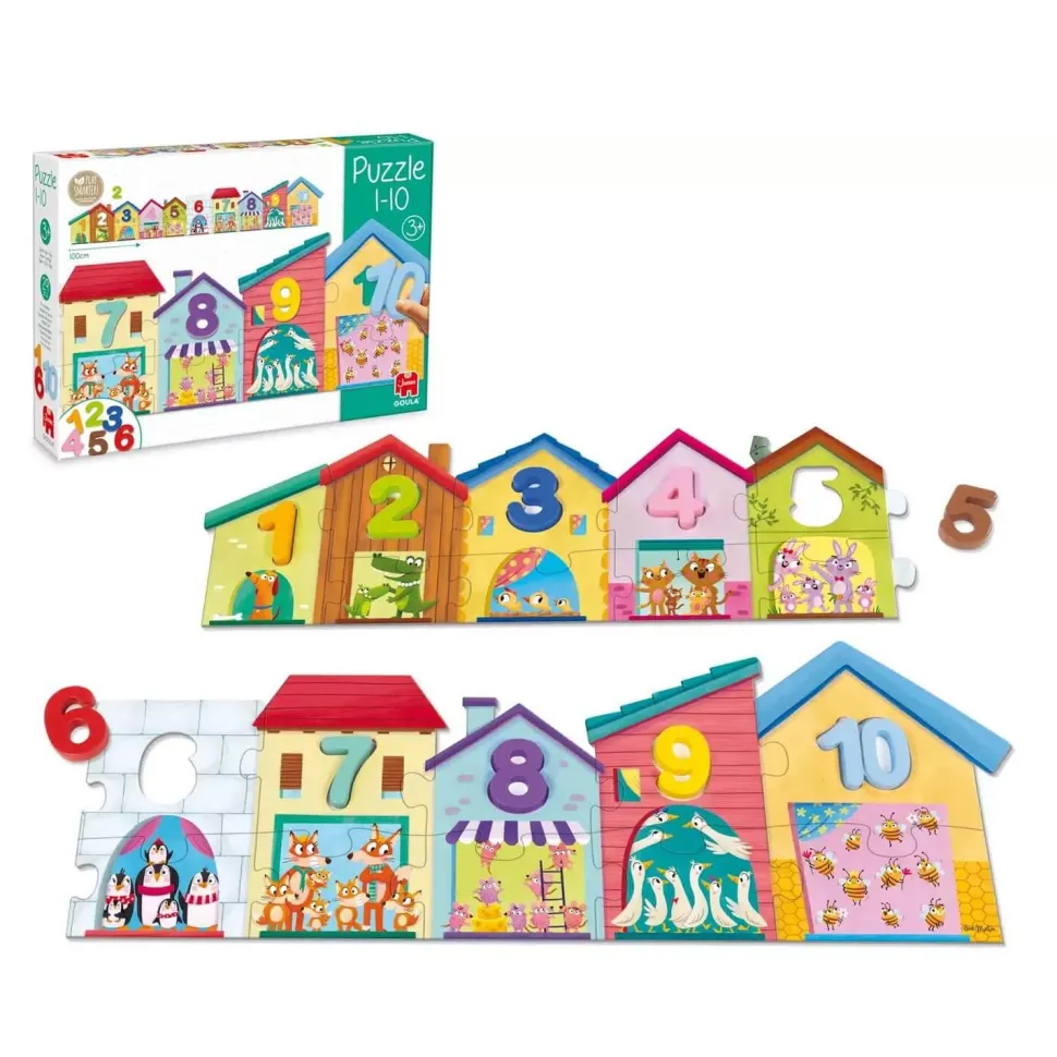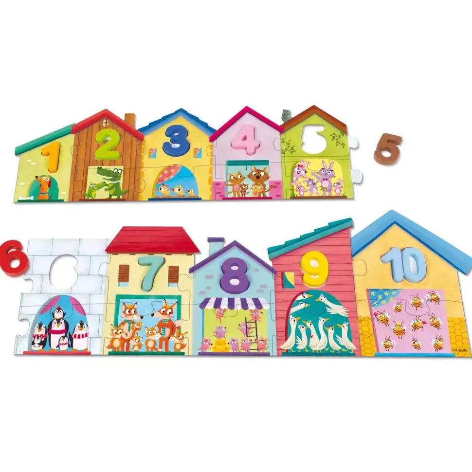 Le jeu Puzzle 1-10 permettra le développement mathématique de votre enfant. Ce jeu lui permettra d’apprendre à compter tout en s’amusant ! Apprends les chiffres de 1 à 10 en construisant un grand puzzle. Compte les animaux dans chaque maison et rapporte ce nombre au chiffre correspondant. Ce produit est le compromis parfait entre l’apprentissage et l’amusement, en effet votre petit apprendra mais ne verra pas le temps passé grâce à l’aspect ludique du jeu !
