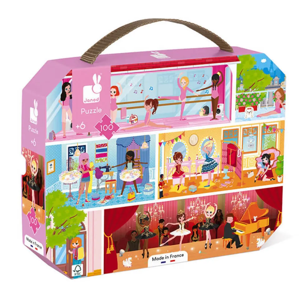 Entrez à l’académie de danse de Paris et suivez le train de vie des petites danseuses du puzzle. Cette illustration est divisée en six parties, montrant les différentes activités des danseuses : l’entraînement, la détente sur le balcon, la création des tenues de scène, l’habillage pour l’entrée sur la scène, le retour à la maison et le spectacle final.Cette valisette avec poignée renferme un puzzle de la marque Janod, ayant pour thème la danse. Il est composé de 100 pièces en carton. Facile à réaliser, il est adapté aux enfants de 6 à 8 ans. De format paysage, il mesure une fois monté 50 cm de longueur et 40 cm de largeur.Fabriqué en France