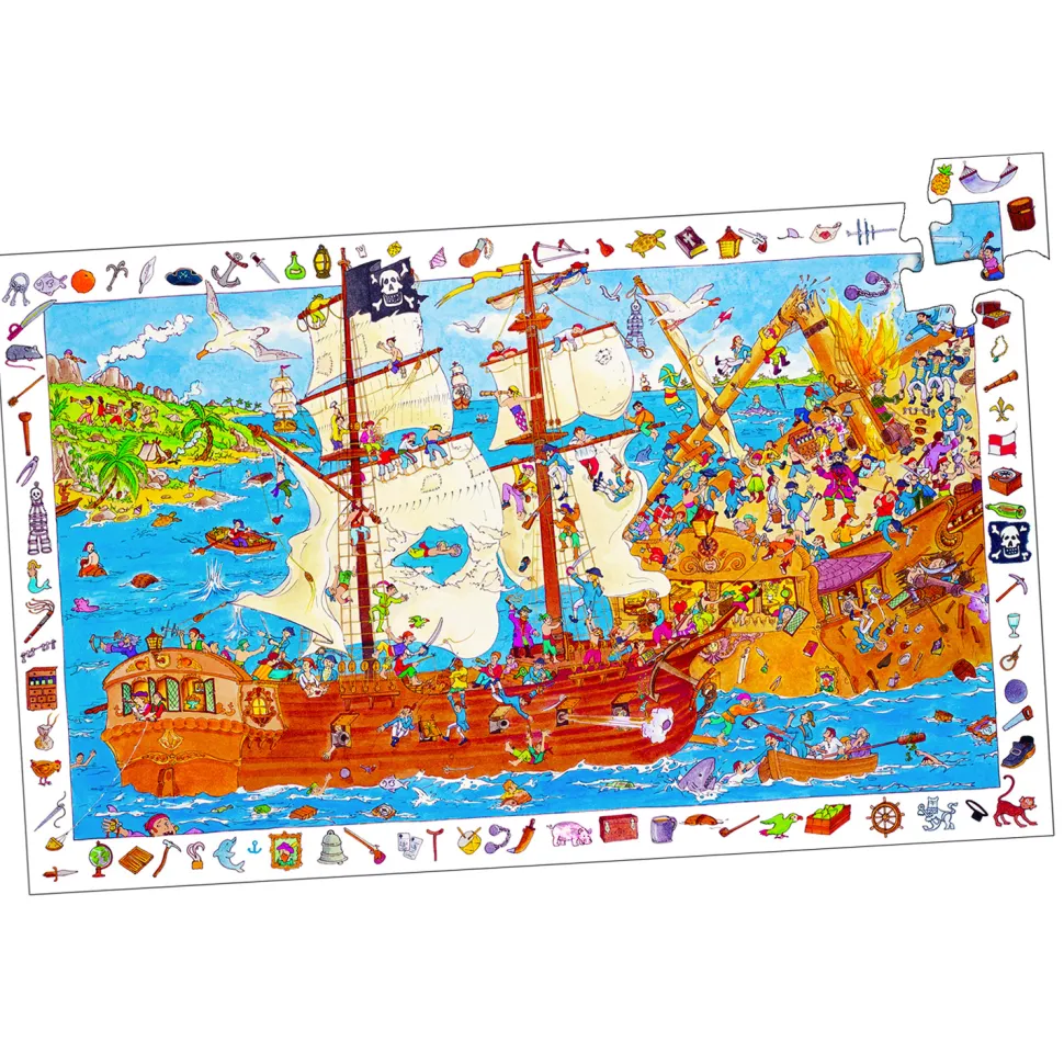 Ah les pirates, un des thèmes favoris des petits garçons !Ce puzzle est également un jeu d’observation : lorsque le puzzle sera assemblé, l’enfant recherchera les nombreux éléments de la frise sur l’image du puzzle.Dimensions du puzzle assemblé : 61 x 38 cm.